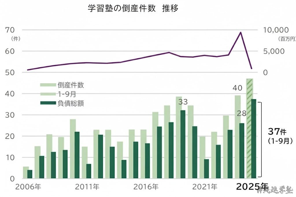 帝国データバンクの調査(PR TIMES, 2025年10月)によると、2025年1月〜9月に発生した学習塾の倒産件数は37件