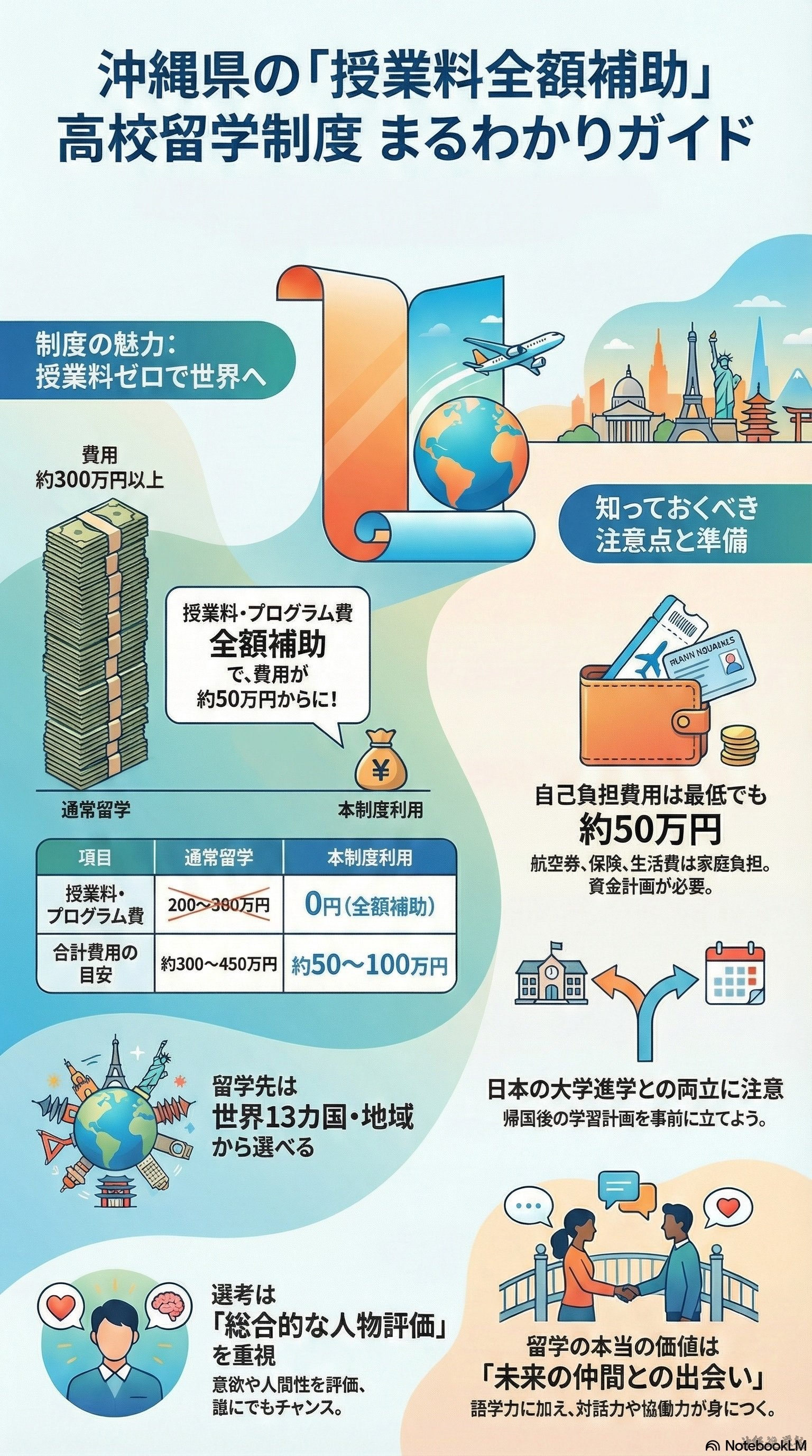 授業料全額補助という制度は、沖縄の高校生に新しい「未来の扉」を開くものです。経済的な理由で海外留学をあきらめざるを得なかった家庭にとっても、現実的に検討できる選択肢となり得ます。