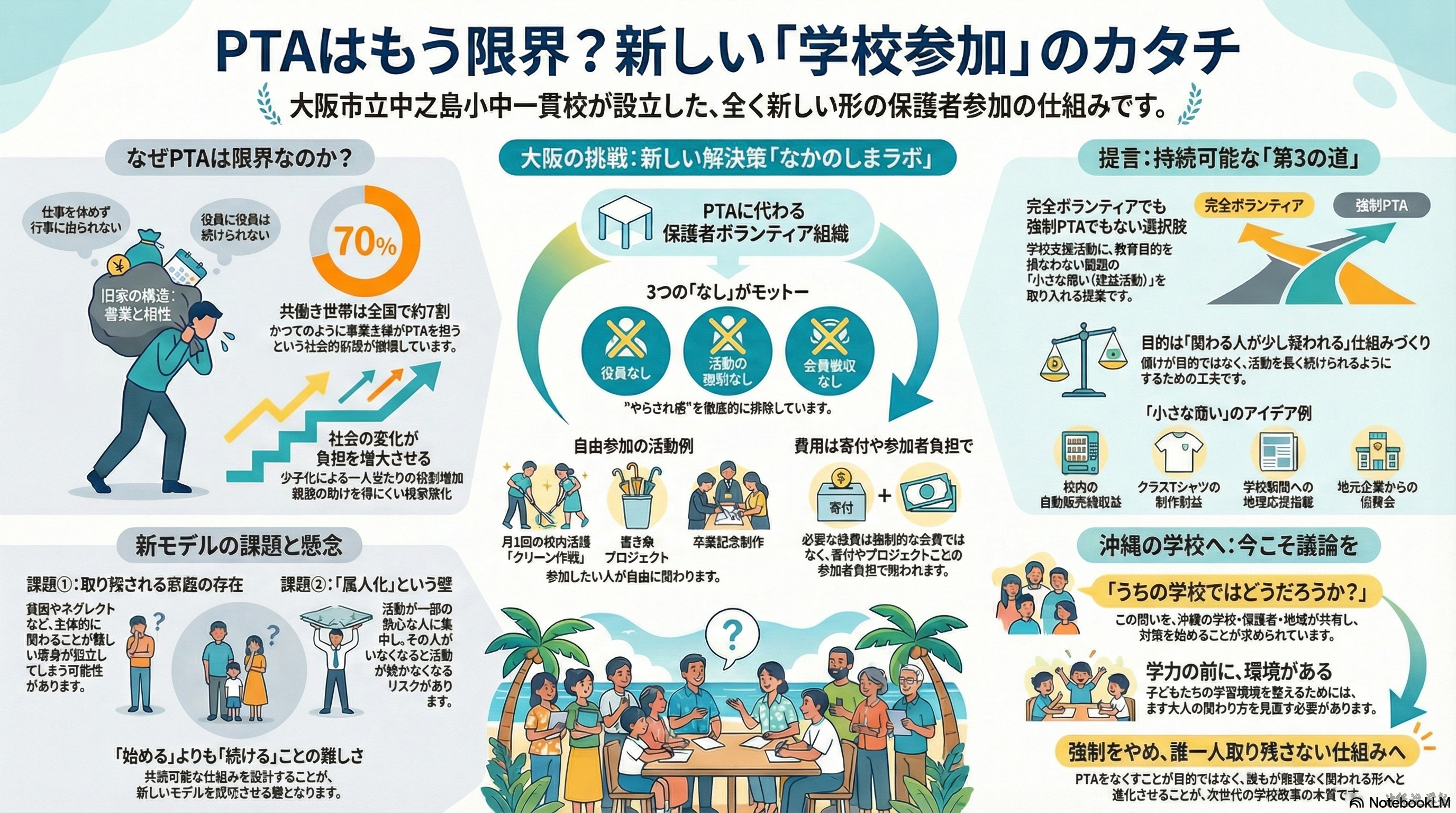 - 大阪市立中之島小中一貫校では、PTAを設置せず、「なかのしまラボ」という保護者ボランティア組織を設立。