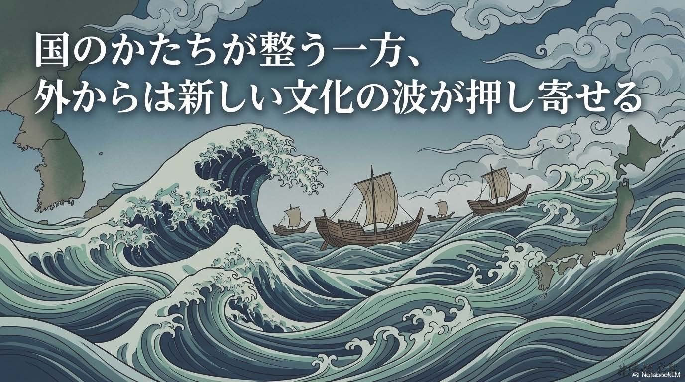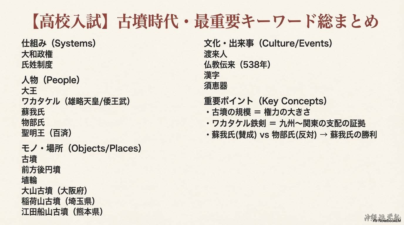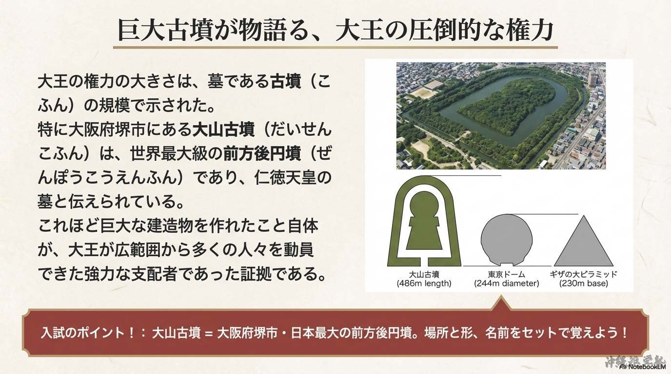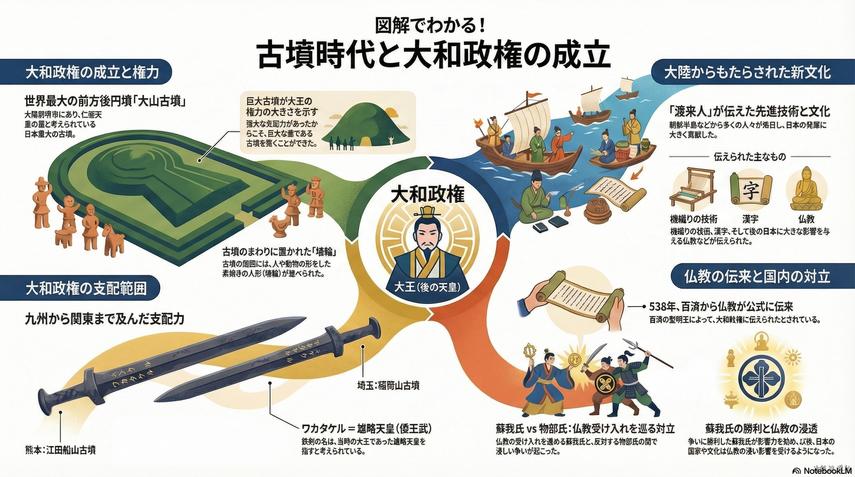 各地の「くに」が次第に一つにまとまり、その連合をまとめる支配者として大王(のちの天皇)が現れた。大王の権力の大きさは古墳の規模によって示され、巨大な古墳を築くことができたことから、その支配力の強さが分かる。大阪府堺市にある大山古墳は、世界最大の前方後円墳であり、仁徳天皇の墓と考えられている。熊本県の江田船山古墳と、埼玉県の稲荷山古墳からは、「ワカタケル」と刻まれた鉄剣が出土している。ワカタケルは雄略天皇(倭王武)と考えられており、これらの発見から、大和政権の勢力が九州から関東地方にまで及んでいたことが分かる。この時代、朝鮮半島から多くの渡来人が来日し、機織りの技術、漢字、仏教などの進んだ文化を伝えた。仏教は538年に百済の聖明王によって伝えられたとされている。これをめぐって、仏教に反対する物部氏と、受け入れを進める蘇我氏の間で対立が起こったが、最終的に蘇我氏が勝利し、政治的な影響力を強めた。これ以後、日本は国家のあり方や文化の面で、仏教の影響を強く受けるようになった。