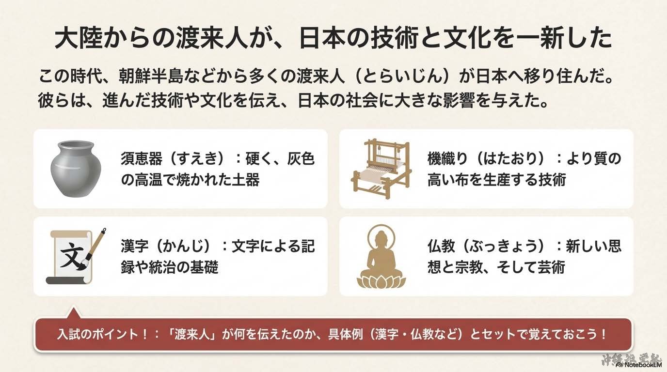 ③渡来人:朝鮮半島などから来て技術や文化を伝えた人々