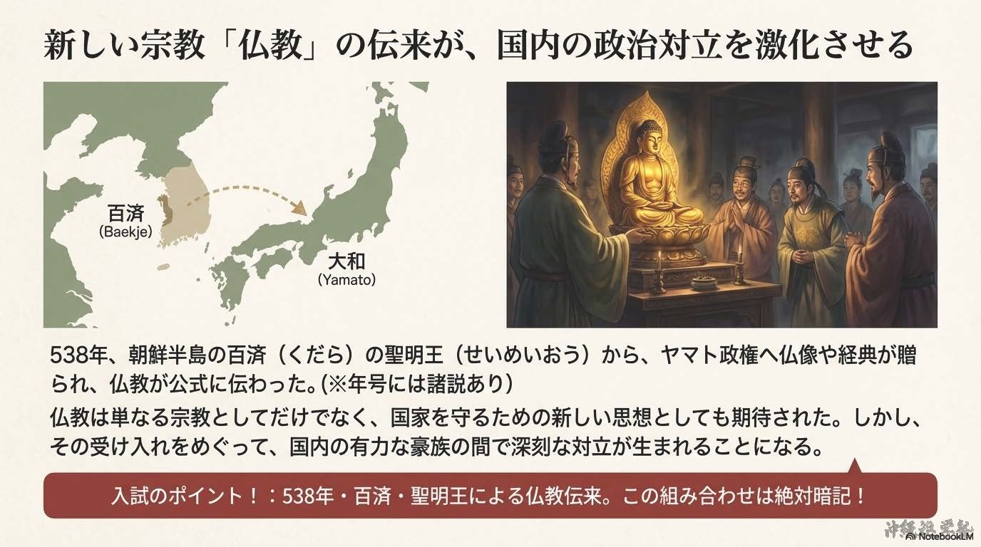 ⑦仏教伝来:538年・百済の聖明王