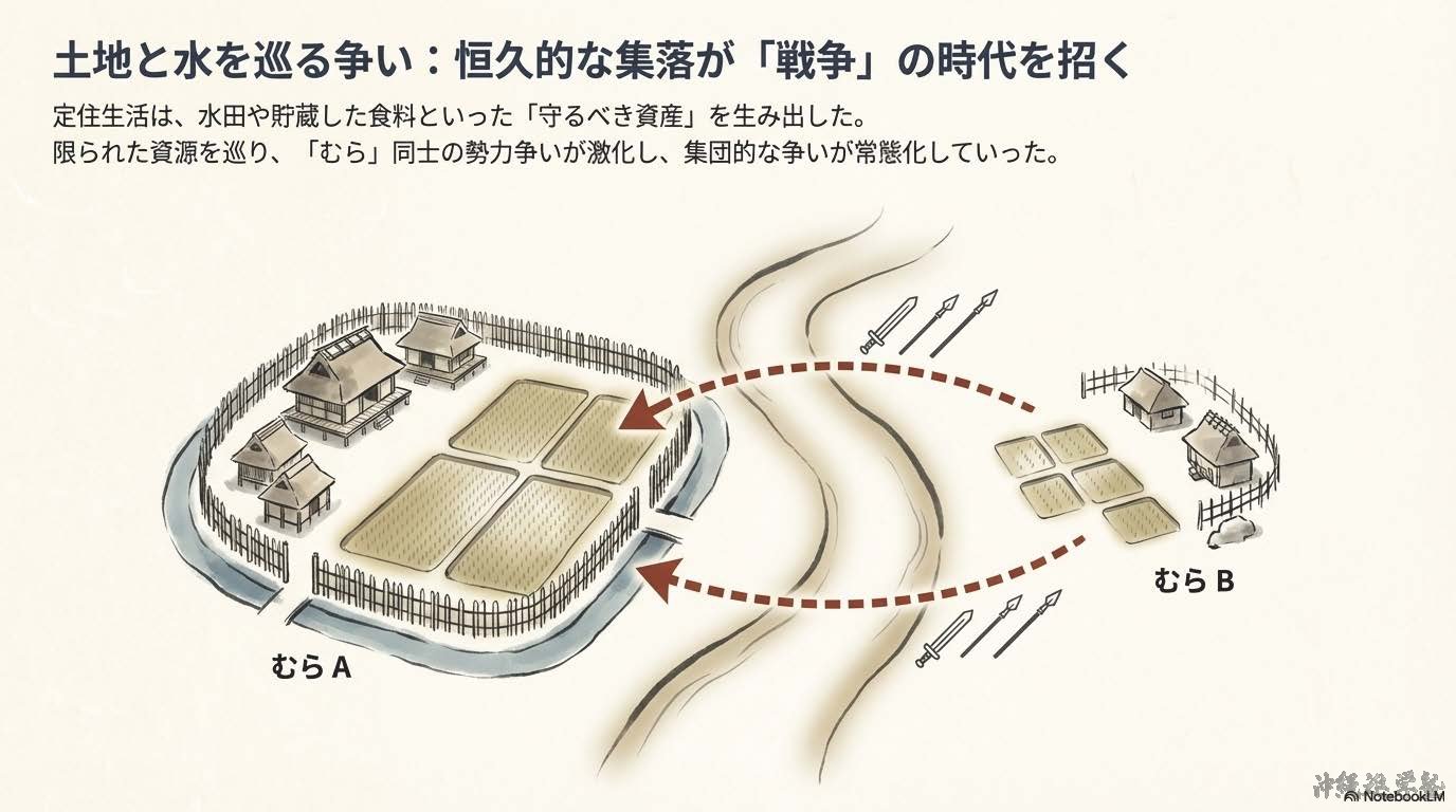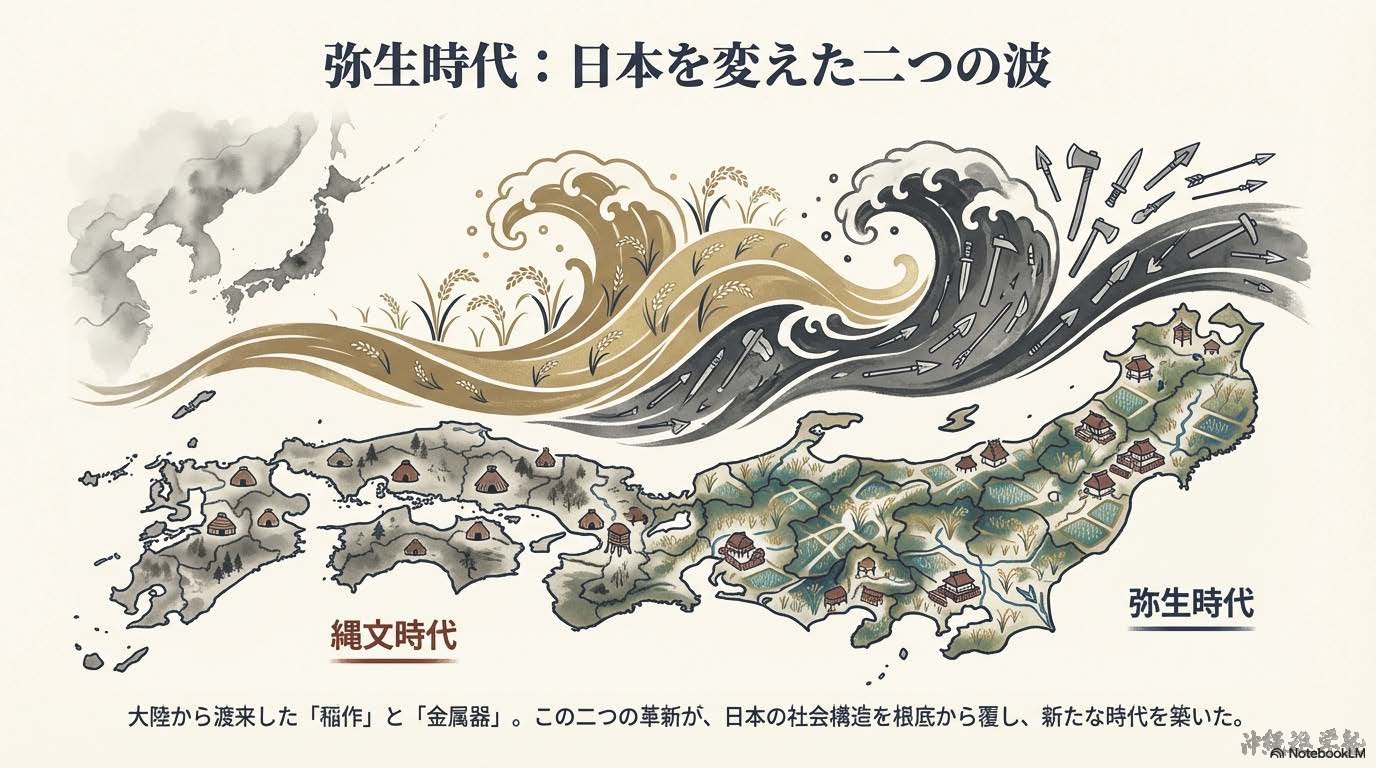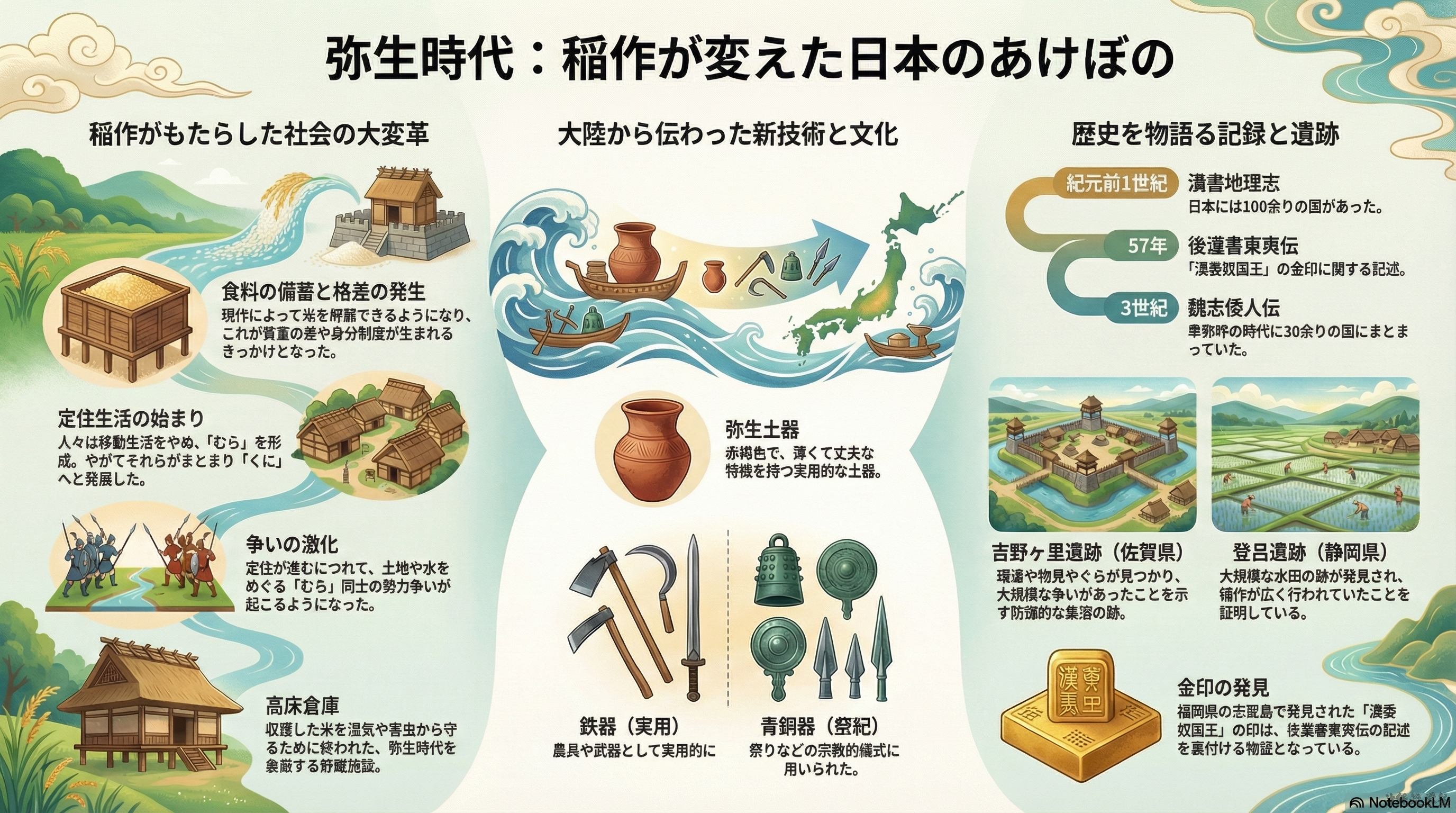 稲作と金属器(鉄器・青銅器)が大陸から伝来したことにより、社会のあり方が大きく変化した。稲作によって食料をためることが可能になり、身分や貧富の差が生じた。また、移動生活から定住生活へと移り、「むら」やそれらがまとまった「くに」が形成された。定住が進むにつれて、土地や水をめぐる争いが起こり、となりの「むら」との勢力争いが見られるようになった。鉄器は主に農具や武器として使われ、生産力や戦いに大きな影響を与えた。一方、青銅器は実用ではなく、祭りなどの宗教的儀式に用いられた。当時の日本の様子は、中国の歴史書に記されている。紀元前1世紀の漢書地理志には日本に「100余りの国」があったとされ、3世紀の魏志倭人伝では、卑弥呼の時代に「30余りの国」にまとまっていたと記されている。これらの史料は、漢書地理志 → 後漢書東夷伝 → 魏志倭人伝 の順で書かれており、時代順の暗記が重要である。