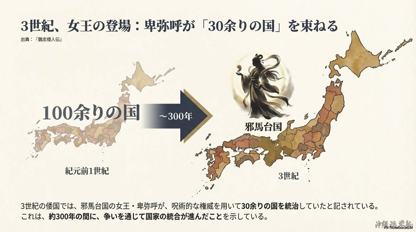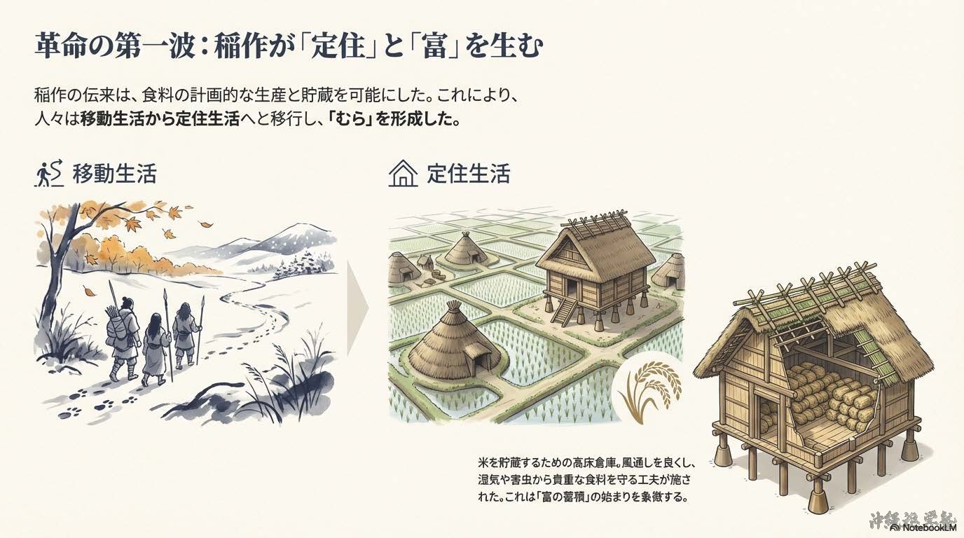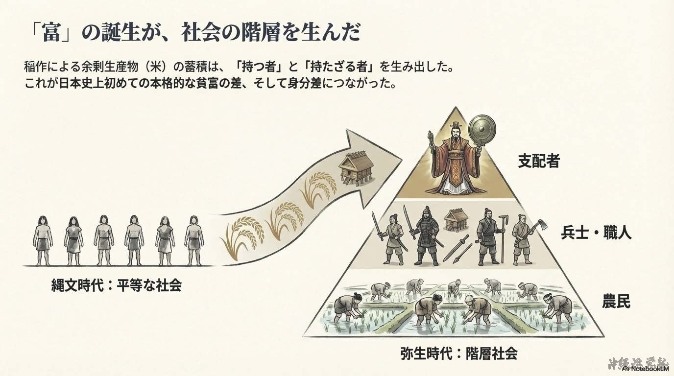 稲作と金属器(鉄器・青銅器)が大陸から伝来したことにより、社会のあり方が大きく変化した。稲作によって食料をためることが可能になり、身分や貧富の差が生じた。また、移動生活から定住生活へと移り、「むら」やそれらがまとまった「くに」が形成された。定住が進むにつれて、土地や水をめぐる争いが起こり、となりの「むら」との勢力争いが見られるようになった。鉄器は主に農具や武器として使われ、生産力や戦いに大きな影響を与えた。一方、青銅器は実用ではなく、祭りなどの宗教的儀式に用いられた。当時の日本の様子は、中国の歴史書に記されている。紀元前1世紀の漢書地理志には日本に「100余りの国」があったとされ、3世紀の魏志倭人伝では、卑弥呼の時代に「30余りの国」にまとまっていたと記されている。これらの史料は、漢書地理志 → 後漢書東夷伝 → 魏志倭人伝 の順で書かれており、時代順の暗記が重要である。