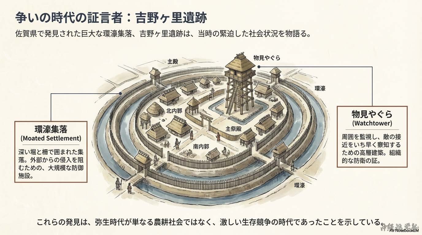 ⑧吉野ヶ里遺跡(佐賀県):環濠集落、物見やぐら(争いの証拠)