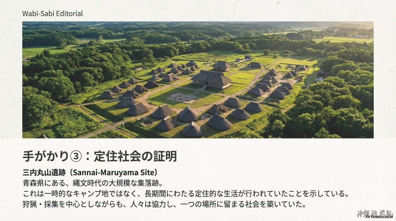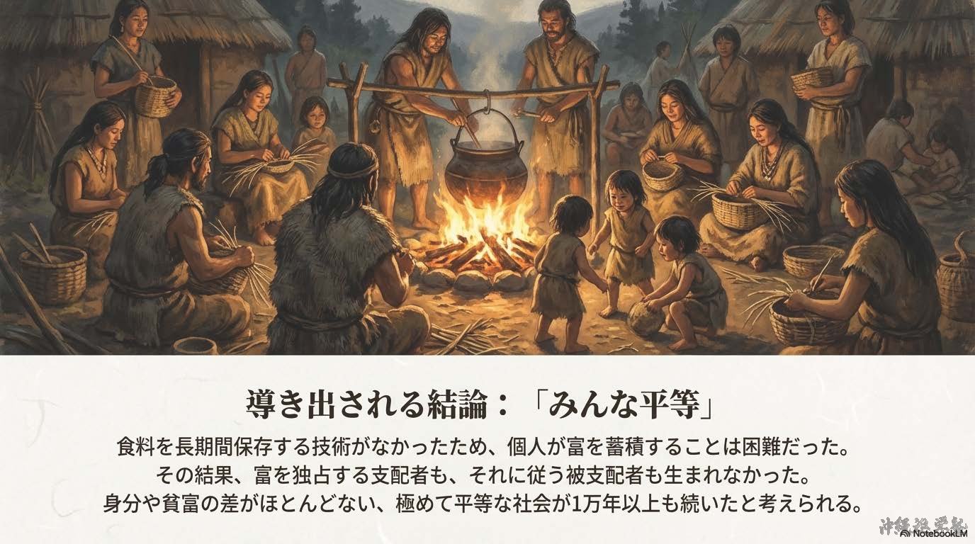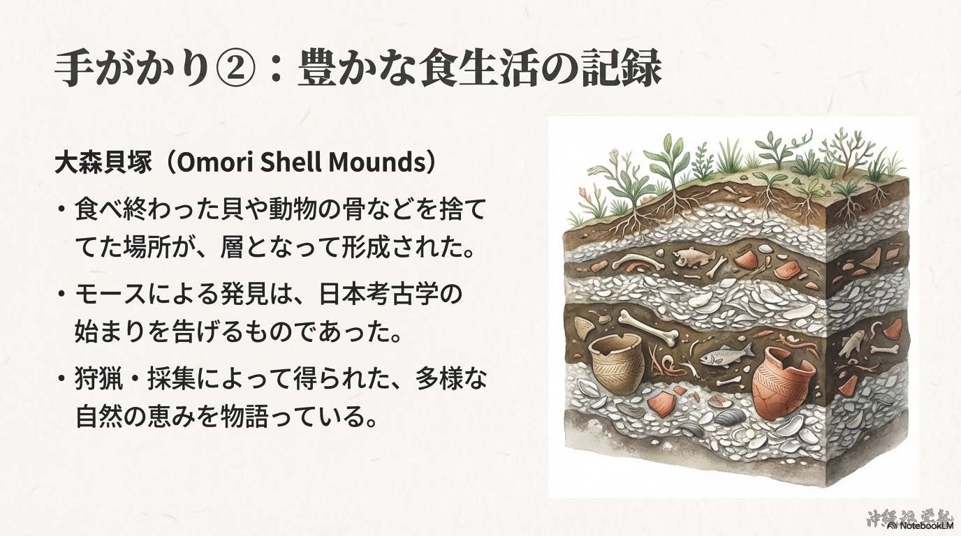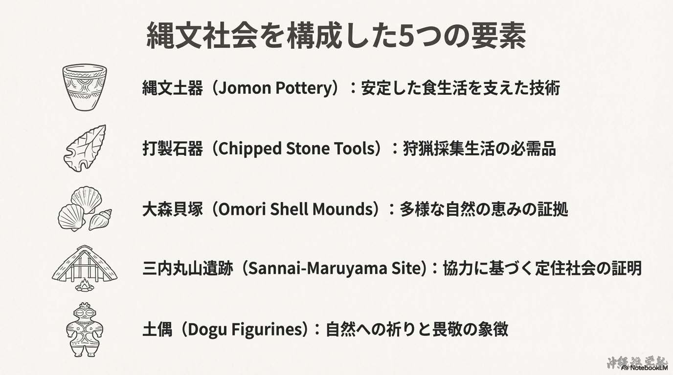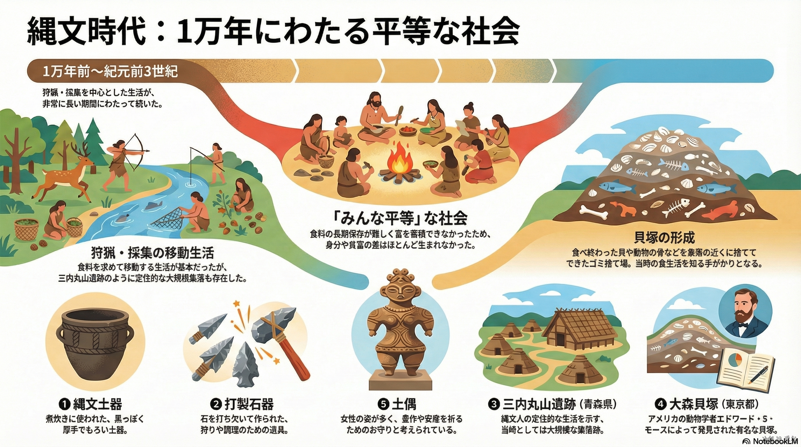 狩猟・採集を中心とした移動生活を行っていた。食料を長期間保存することができなかったため、富をためることができず、身分や貧富の差はほとんど生まれなかった。食べ終わった貝や動物の骨などは集落の近くに捨てられ、貝塚が形成された。青森県の三内丸山遺跡は、当時としては大規模な集落跡であり、縄文人の定住的な生活を示している。