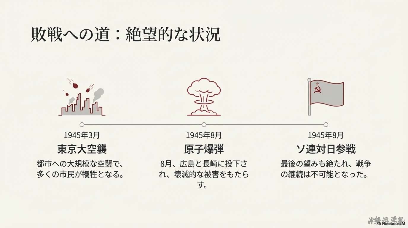 昭和時代に入ると、日本は不況と社会不安の中で、次第に軍部の発言力が強まっていった。1929年、アメリカを発端とする世界恐慌(せかいきょうこう)が起こり、日本も深刻な不景気に陥った。とくに農村では不作と不況が重なり、生活が成り立たなくなる人々が急増した。こうした不満は政治への批判となり、政党政治は「国を守れない」「不況を解決できない」として信頼を失っていった。その一方で、「軍が国を立て直すべきだ」という考えが広がり、軍部が政治に強く関わるようになった。1931年、関東軍(かんとうぐん)は中国東北部(満州〈まんしゅう〉)で満州事変(まんしゅうじへん)を起こし、日本は満州を占領した。翌年、日本は満州に満州国(まんしゅうこく)を建国したが、これは日本が実権を握る国であった。この行動を問題視した国際連盟は、日本を批判し、リットン調査団を派遣した。日本政府はこの勧告を受け入れず、1933年に国際連盟を脱退した。軍部の影響力はさらに強まり、1932年には海軍の青年将校らによる五・一五事件(ご・いちごじけん)が起こり、首相の犬養毅(いぬかいつよし)が暗殺された。これをきっかけに、政党内閣は終わり、軍人や官僚が中心となる政治へと移行していった。1936年には、陸軍の青年将校が中心となってクーデターを起こす二・二六事件(に・にろくじけん)が発生した。この事件は失敗に終わったが、軍の発言力はさらに強まり、政府は軍の意向を無視できなくなった。1937年、中国との間で日中戦争(にっちゅうせんそう)が始まった。戦争は短期間で終わると考えられていたが、長期化し、日本の国力を大きく消耗させた。戦争を続けるため、政府は国民生活を厳しく統制し、国家総動員法(こっかそうどういんほう)を制定して、人・物・金を戦争に優先的に回した。その後、日本はドイツ・イタリアと結んで日独伊三国同盟(にちどくいさんごくどうめい)を結成し、戦争体制をさらに強めた。1941年、日本は資源確保を目的として、アメリカ・イギリスと対立を深め、ついに真珠湾攻撃(しんじゅわんこうげき)を行い、太平洋戦争(たいへいようせんそう)が始まった。戦争が長引くにつれ、日本は次第に不利な状況に追い込まれた。1945年、アメリカ軍は東京大空襲を行い、多くの市民が犠牲となった。同年8月、広島・長崎に原子爆弾(げんしばくだん)が投下され、甚大な被害が出た。さらに、ソ連(ソビエト連邦)が対日参戦したこともあり、日本は戦争継続が不可能となった。1945年8月15日、昭和天皇(しょうわてんのう)はラジオ放送(玉音放送〈ぎょくおんほうそう〉)で国民に終戦を伝え、日本は連合国に降伏した。これにより、昭和前期の戦争の時代は終わりを迎えた。