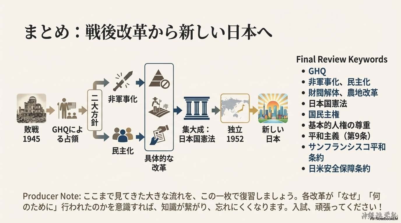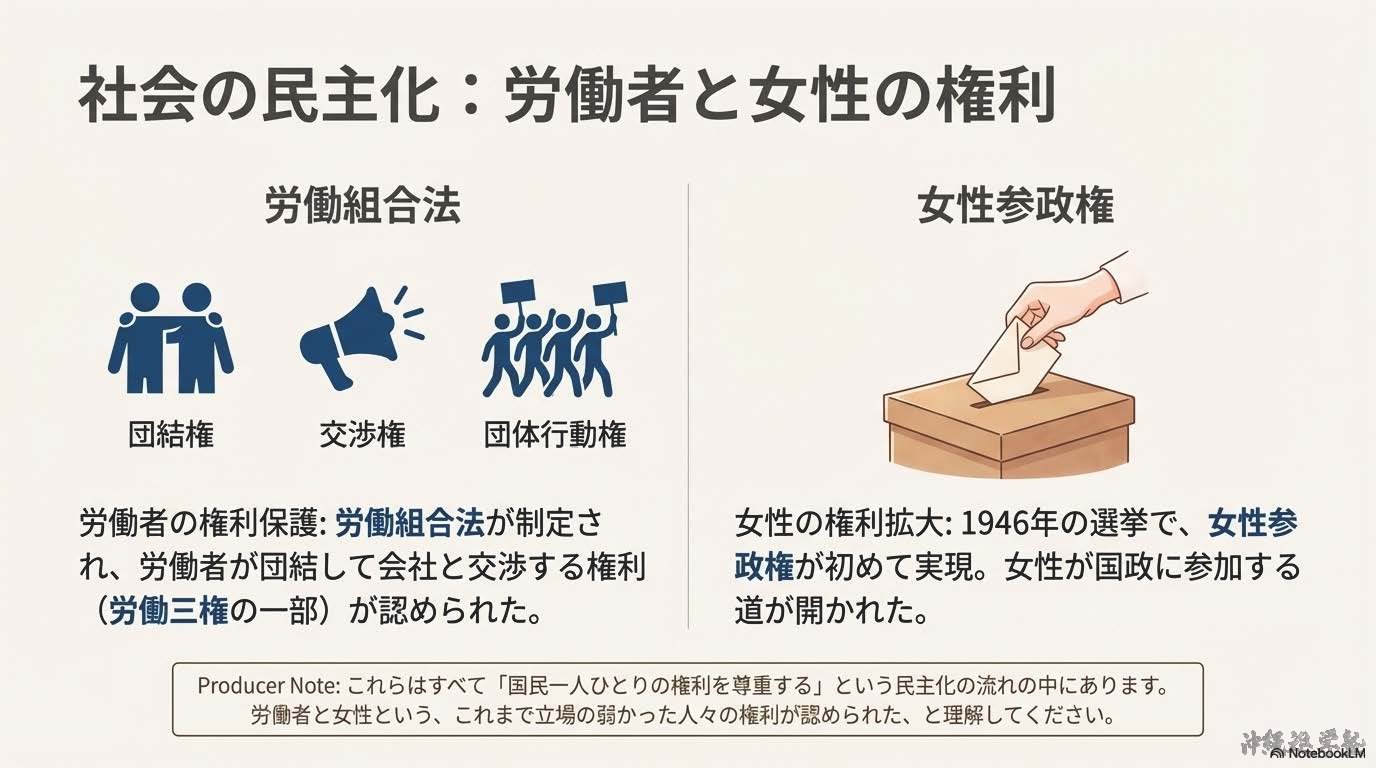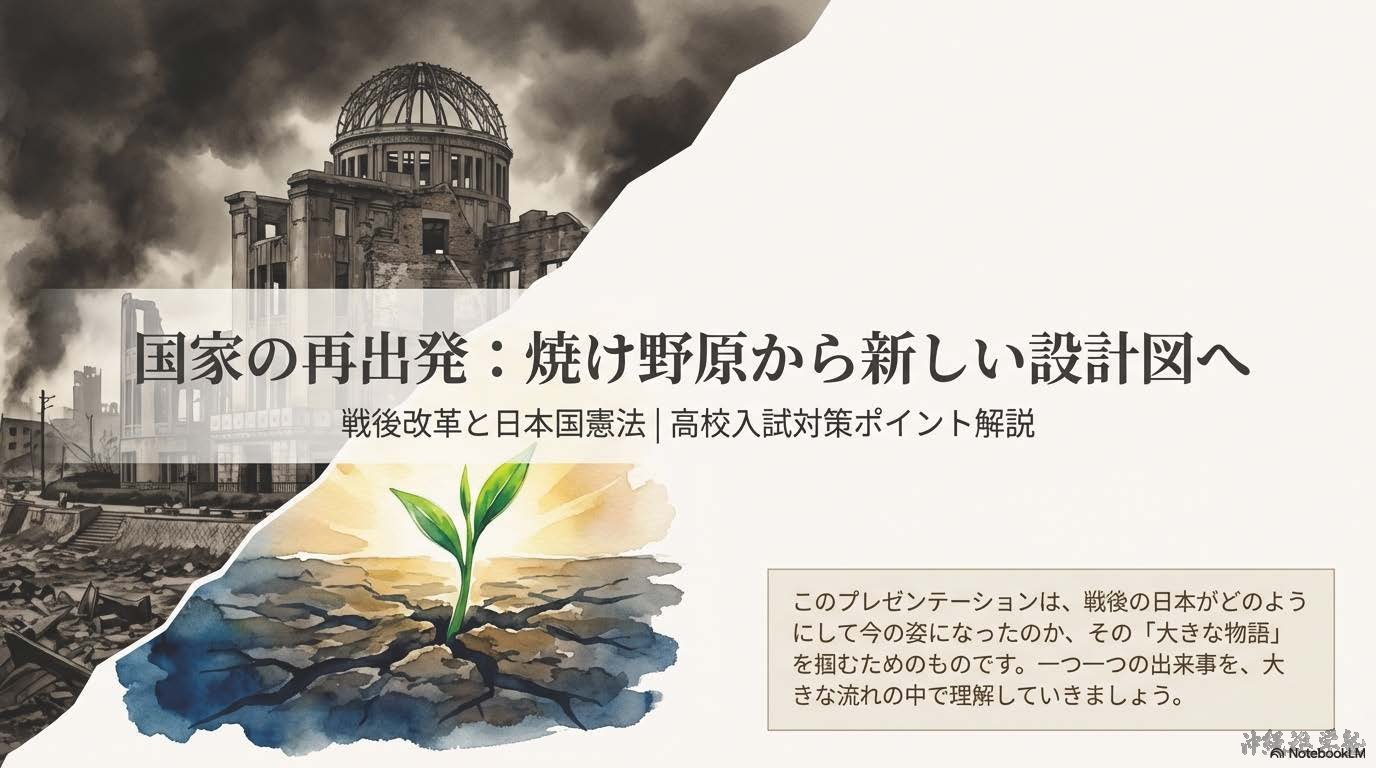 1945年8月15日、日本は第二次世界大戦に敗れ、連合国に降伏した。その後、日本は連合国の占領下に置かれ、占領政策の中心となったのがアメリカである。日本の占領と改革を実際に進めたのは、GHQ(ジーエイチキュー:連合国軍総司令部)であり、最高司令官はマッカーサーであった。GHQは、日本が再び戦争を起こさない国になることを目的に、政治・経済・社会の仕組みを大きく変える戦後改革を行った。まず、戦争を指導した責任を問うため、東京裁判(とうきょうさいばん)が開かれた。また、日本の軍事力を完全になくすため、軍隊の解体が行われ、日本は戦争を行う力を失った。次に、国民の生活を安定させ、民主主義を社会に根づかせる改革が進められた。農村では、地主が多くの土地を所有し、小作人が苦しい生活を送っていたため、農地改革(のうちかいかく)が実施された。地主の土地を国が買い上げ、小作人に分け与えたことで、自分の土地を持つ自作農が増え、農村の民主化が進んだ。また、経済を独占していた大企業グループを解体するため、財閥解体(ざいばつかいたい)が行われた。さらに、労働者の立場を守るため、労働組合法(ろうどうくみあいほう)が制定され、労働組合をつくる権利が認められた。政治の分野では、1946年の選挙で女性が初めて選挙権を行使し、男女平等の実現に向けた一歩となった。これらの改革と並行して、日本の新しい国のあり方を定めるため、憲法の制定が進められた。1946年に公布され、1947年に施行されたのが日本国憲法(にほんこくけんぽう)である。この憲法は、国の政治の最終的な決定権は国民にあるとする国民主権(こくみんしゅけん)を基本原理とし、天皇は政治的権力を持たない象徴天皇制(しょうちょうてんのうせい)とされた。日本国憲法では、すべての人が生まれながらに持つ権利として基本的人権(きほんてきじんけん)の尊重が定められた。言論・思想・信教の自由が保障され、法の下の平等や男女平等も明記された。これにより、日本社会は戦前とは大きく異なる民主的な社会へと変化した。さらに、日本国憲法の大きな特徴が平和主義である。第9条では、戦争や武力の行使を永久に放棄し、戦力を持たないことが定められ、日本は平和国家として再出発することになった。戦後の日本は、深刻な物不足やインフレに苦しんだが、復興が進み、1951年にはサンフランシスコ平和条約を結んだ。翌1952年、日本は占領を終えて主権を回復した。同時に、アメリカとの間で日米安全保障条約を結び、日本の安全をアメリカ軍に依存する体制が始まった。