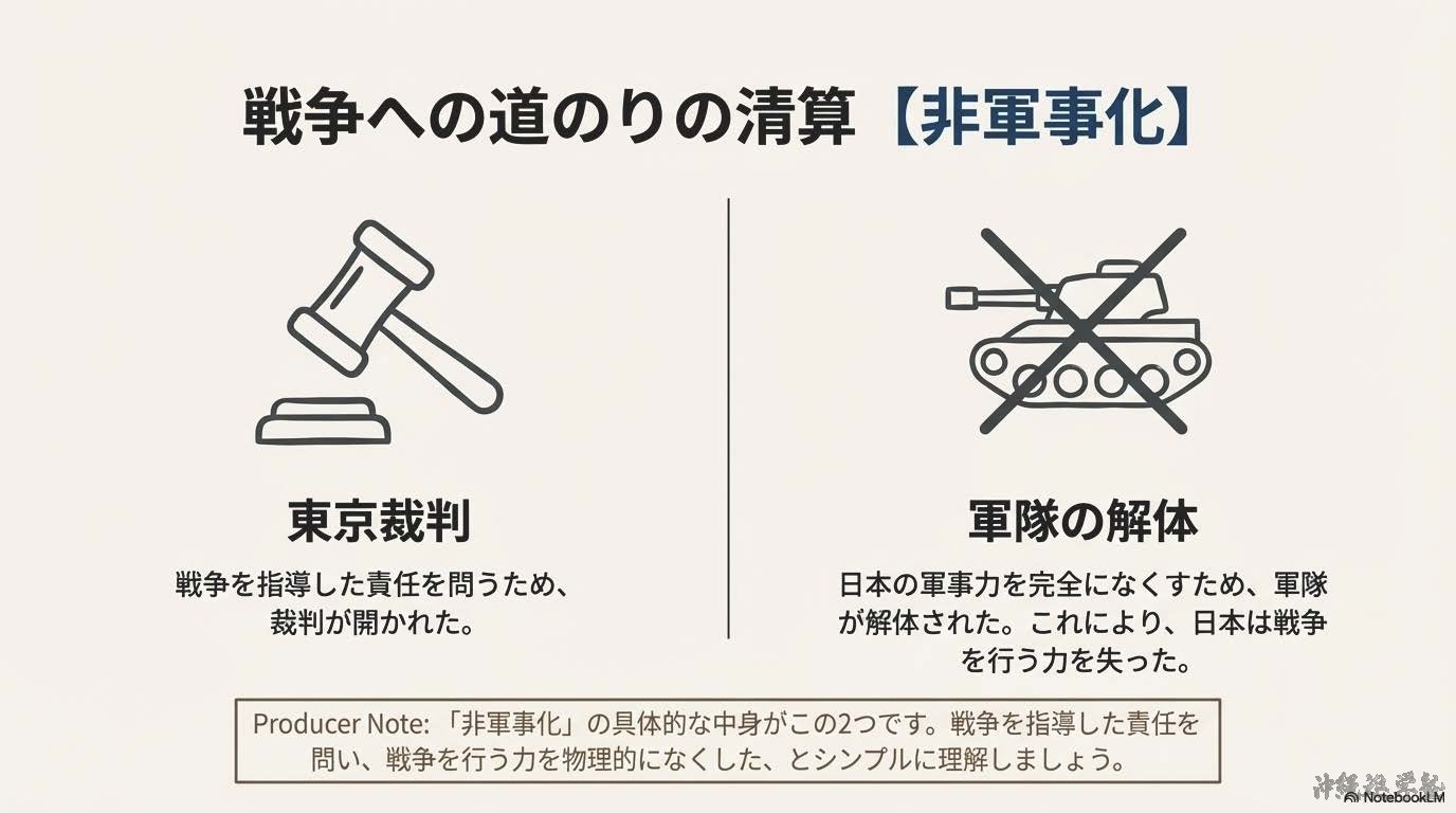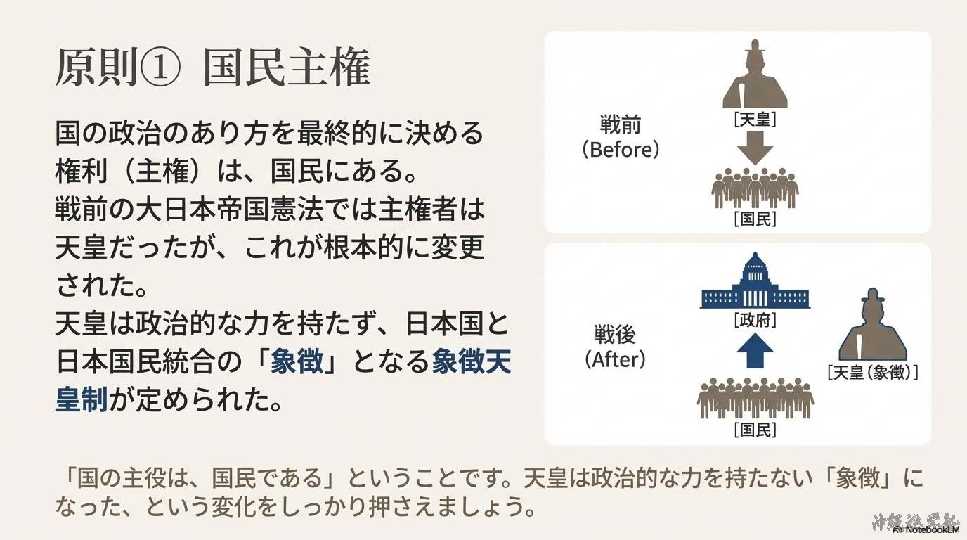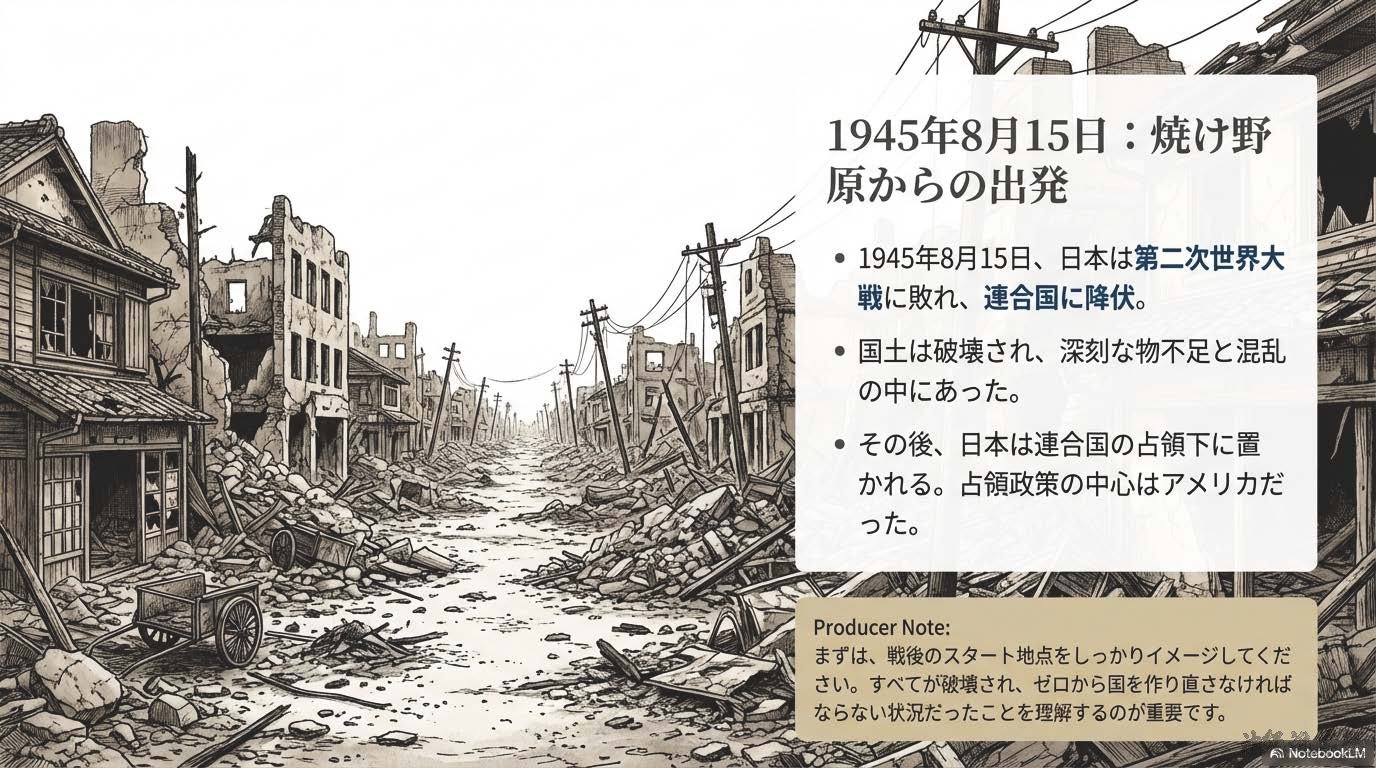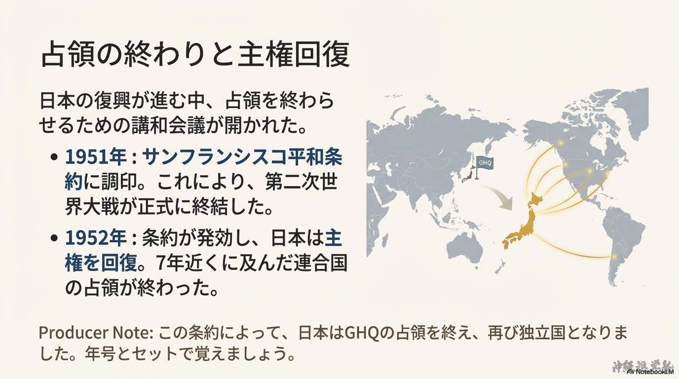 1945年8月15日、日本は第二次世界大戦に敗れ、連合国に降伏した。その後、日本は連合国の占領下に置かれ、占領政策の中心となったのがアメリカである。日本の占領と改革を実際に進めたのは、GHQ(ジーエイチキュー:連合国軍総司令部)であり、最高司令官はマッカーサーであった。GHQは、日本が再び戦争を起こさない国になることを目的に、政治・経済・社会の仕組みを大きく変える戦後改革を行った。まず、戦争を指導した責任を問うため、東京裁判(とうきょうさいばん)が開かれた。また、日本の軍事力を完全になくすため、軍隊の解体が行われ、日本は戦争を行う力を失った。次に、国民の生活を安定させ、民主主義を社会に根づかせる改革が進められた。農村では、地主が多くの土地を所有し、小作人が苦しい生活を送っていたため、農地改革(のうちかいかく)が実施された。地主の土地を国が買い上げ、小作人に分け与えたことで、自分の土地を持つ自作農が増え、農村の民主化が進んだ。また、経済を独占していた大企業グループを解体するため、財閥解体(ざいばつかいたい)が行われた。さらに、労働者の立場を守るため、労働組合法(ろうどうくみあいほう)が制定され、労働組合をつくる権利が認められた。政治の分野では、1946年の選挙で女性が初めて選挙権を行使し、男女平等の実現に向けた一歩となった。これらの改革と並行して、日本の新しい国のあり方を定めるため、憲法の制定が進められた。1946年に公布され、1947年に施行されたのが日本国憲法(にほんこくけんぽう)である。この憲法は、国の政治の最終的な決定権は国民にあるとする国民主権(こくみんしゅけん)を基本原理とし、天皇は政治的権力を持たない象徴天皇制(しょうちょうてんのうせい)とされた。日本国憲法では、すべての人が生まれながらに持つ権利として基本的人権(きほんてきじんけん)の尊重が定められた。言論・思想・信教の自由が保障され、法の下の平等や男女平等も明記された。これにより、日本社会は戦前とは大きく異なる民主的な社会へと変化した。さらに、日本国憲法の大きな特徴が平和主義である。第9条では、戦争や武力の行使を永久に放棄し、戦力を持たないことが定められ、日本は平和国家として再出発することになった。戦後の日本は、深刻な物不足やインフレに苦しんだが、復興が進み、1951年にはサンフランシスコ平和条約を結んだ。翌1952年、日本は占領を終えて主権を回復した。同時に、アメリカとの間で日米安全保障条約を結び、日本の安全をアメリカ軍に依存する体制が始まった。