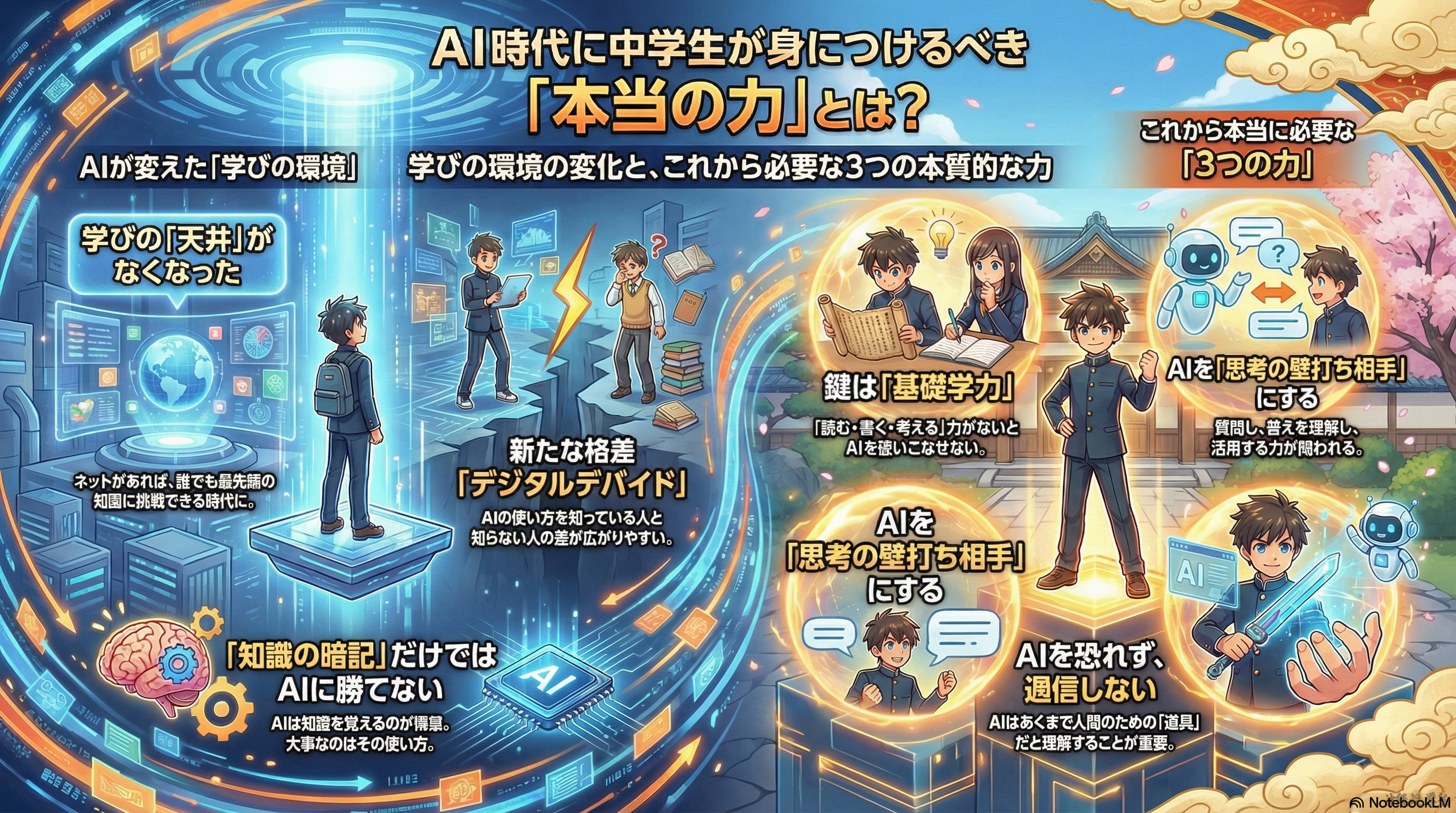 沖縄の中学生・上原キヨラさんが、東京大学のAI入門講座を修了したというニュースは、学びの形が大きく変わったことを示しています。今はネットとAIを使えば、地域に関係なく最先端の学びに挑戦できます。一方で、その変化に気づかない人との差は広がりやすくなっています。AI時代に大切なのは、暗記だけでなく、問いを立て、考え、使いこなす力です。その土台となるのは「読む・書く・考える」という基礎学力です。AIは人間の代わりではなく、使い方次第で可能性を広げる道具であり、学び続ける姿勢こそが未来を切り開きます。