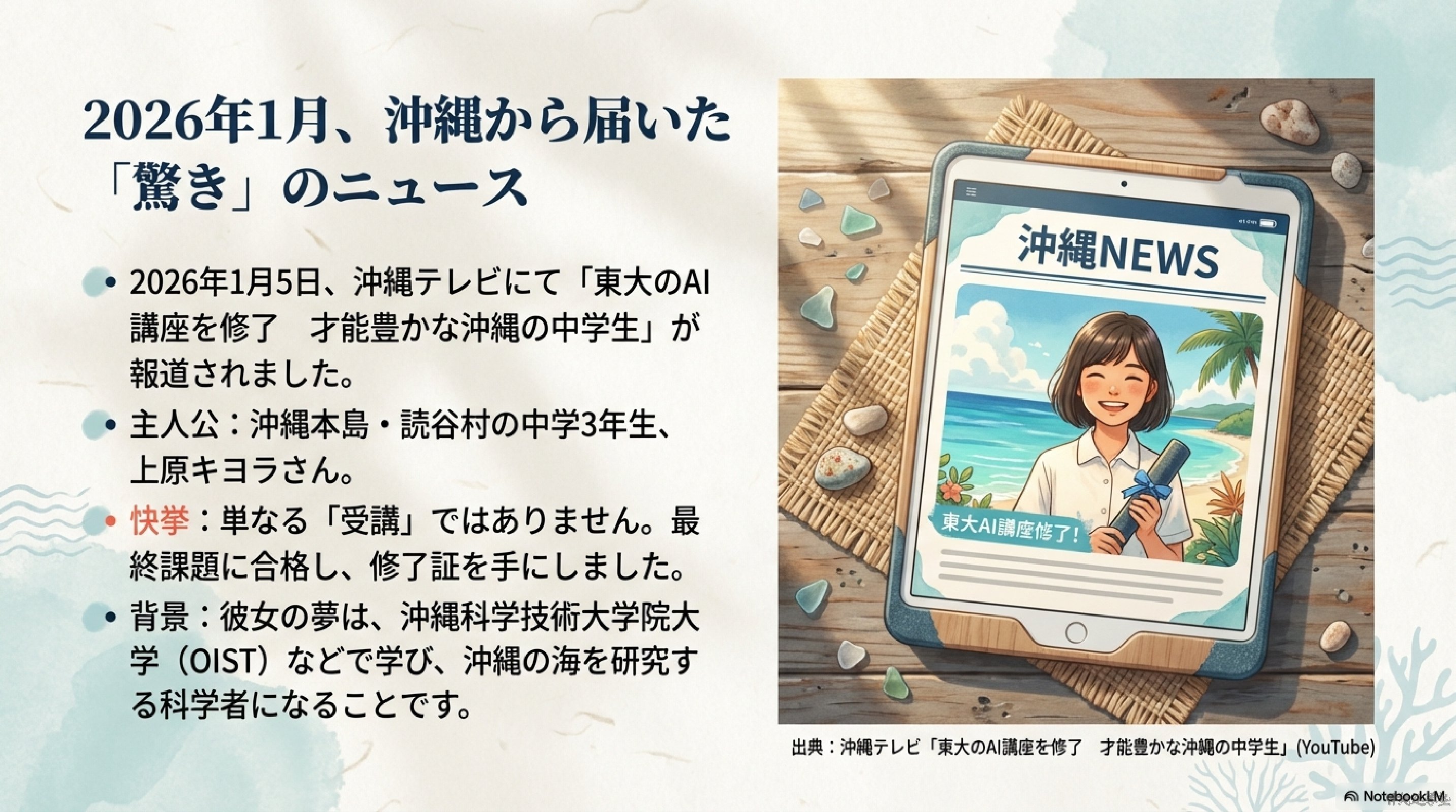 2026年1月5日、沖縄テレビは「東大のAI講座を修了 才能豊かな沖縄の中学生」というニュースを放送しました。