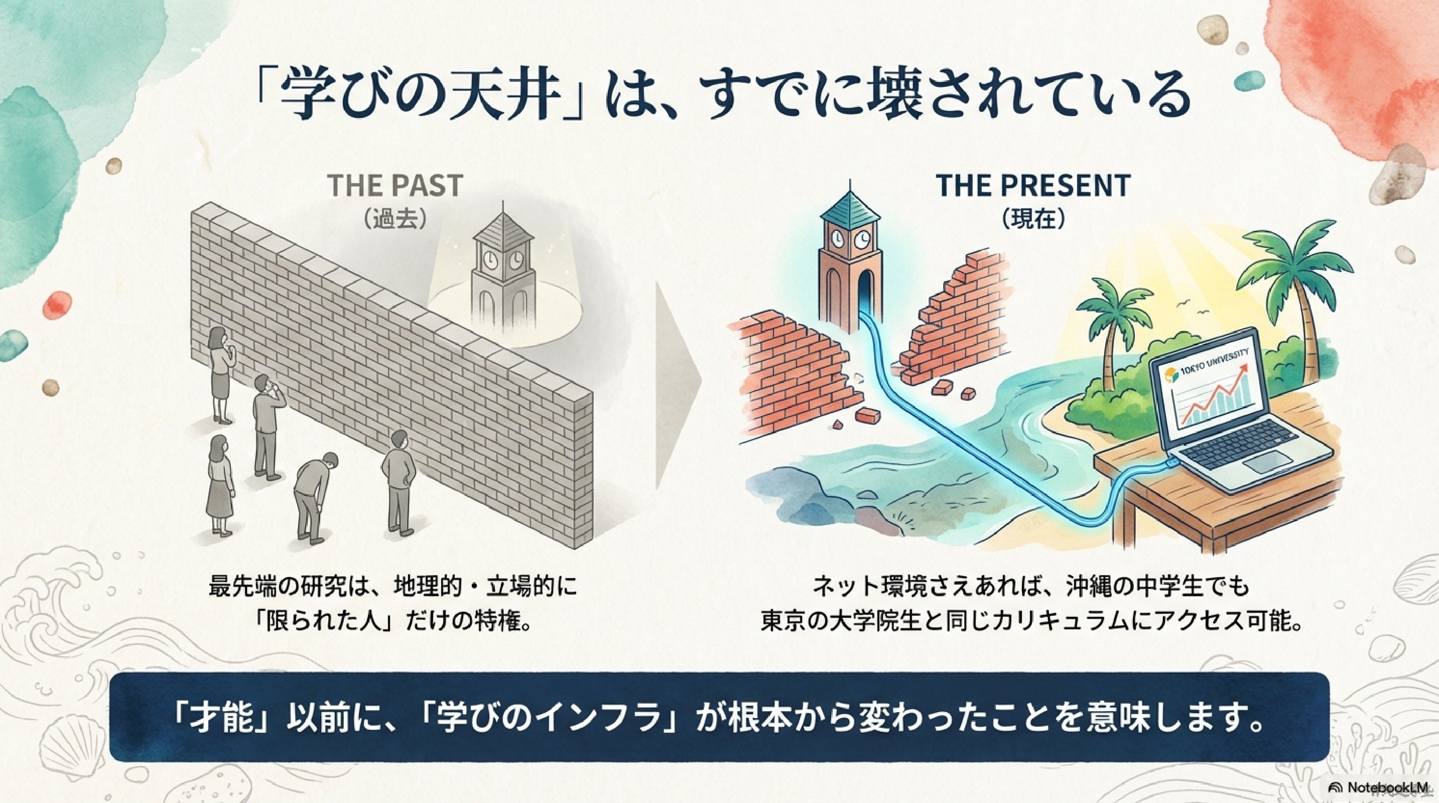 かつて、東大の研究室の講義や最先端のAIの学びは、限られた人のものでした。しかし今は、ネット環境があれば、沖縄の中学生でも挑戦できる。これは「根性」や「才能」の話というより、学びの前提条件が変わったという話です。