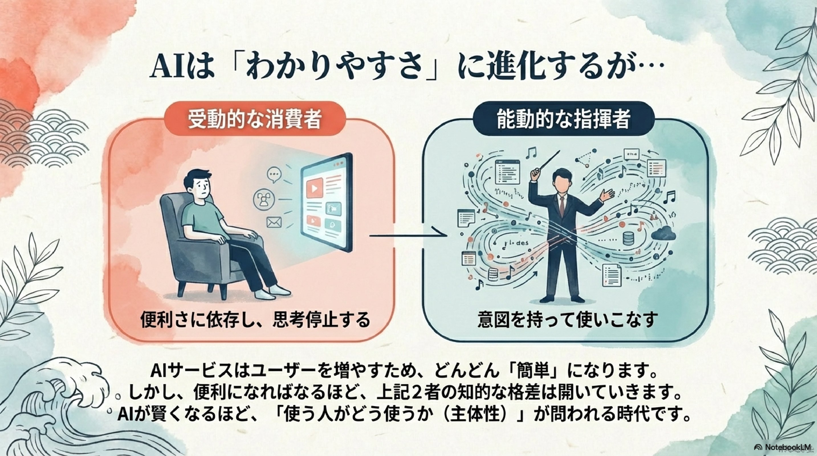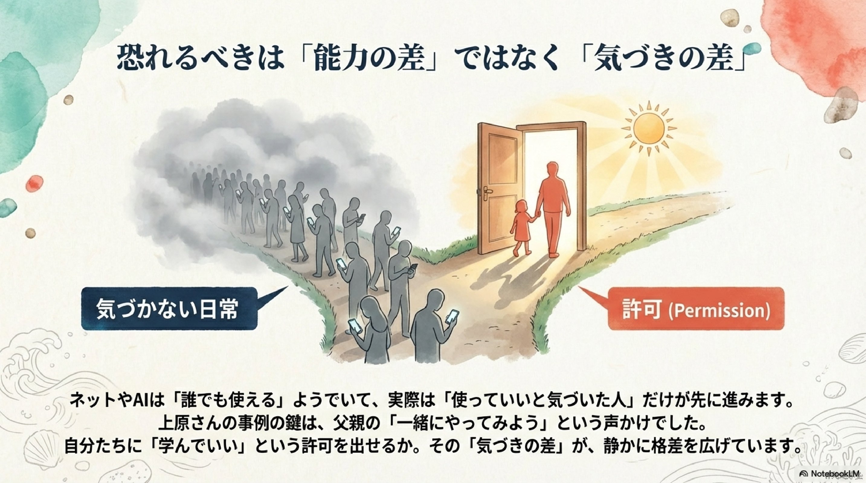 一方で、この変化はやさしいだけではありません。ネットやAIは「誰でも使える」ように見えて、実際は使い方を知っている人が先に進みやすい道具です。
