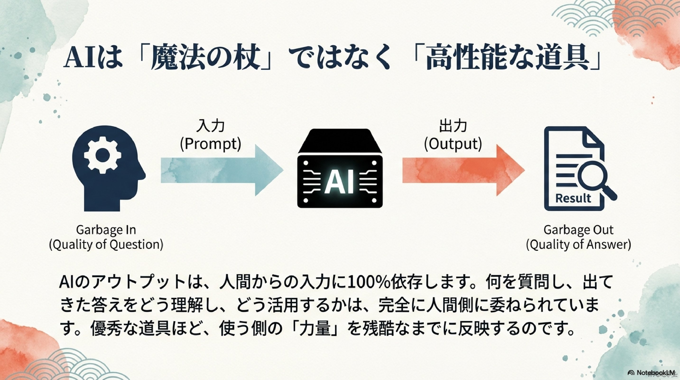 AIの答えは、質問の仕方で大きく変わります。つまり、AIが優秀であるほど、使う側の姿勢や理解力が結果に直結します。ここが、これからの学びの重要ポイントです。