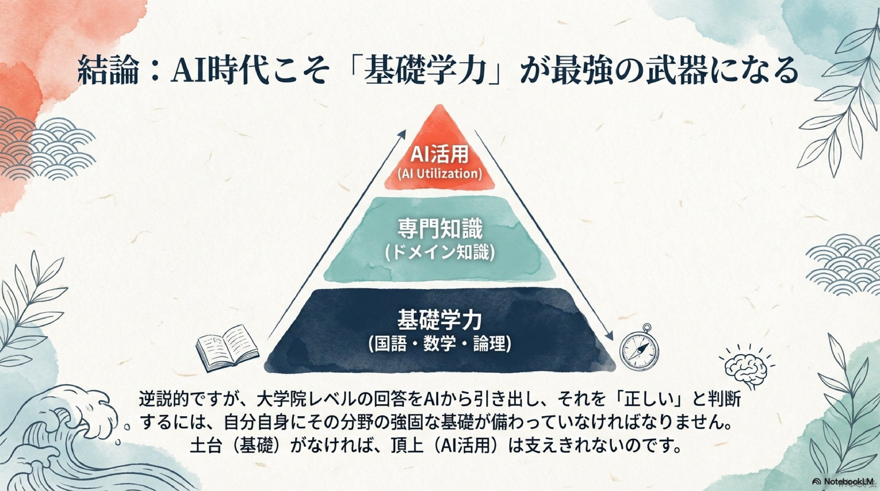 AI時代の学びで見落とされがちなのが、基礎学力の大切さです。AIは便利ですが、理解できない内容を出されても活用できません。小学生レベルの知識が土台にないと、大学院レベルの話は扱えない。これはAIでも同じです。