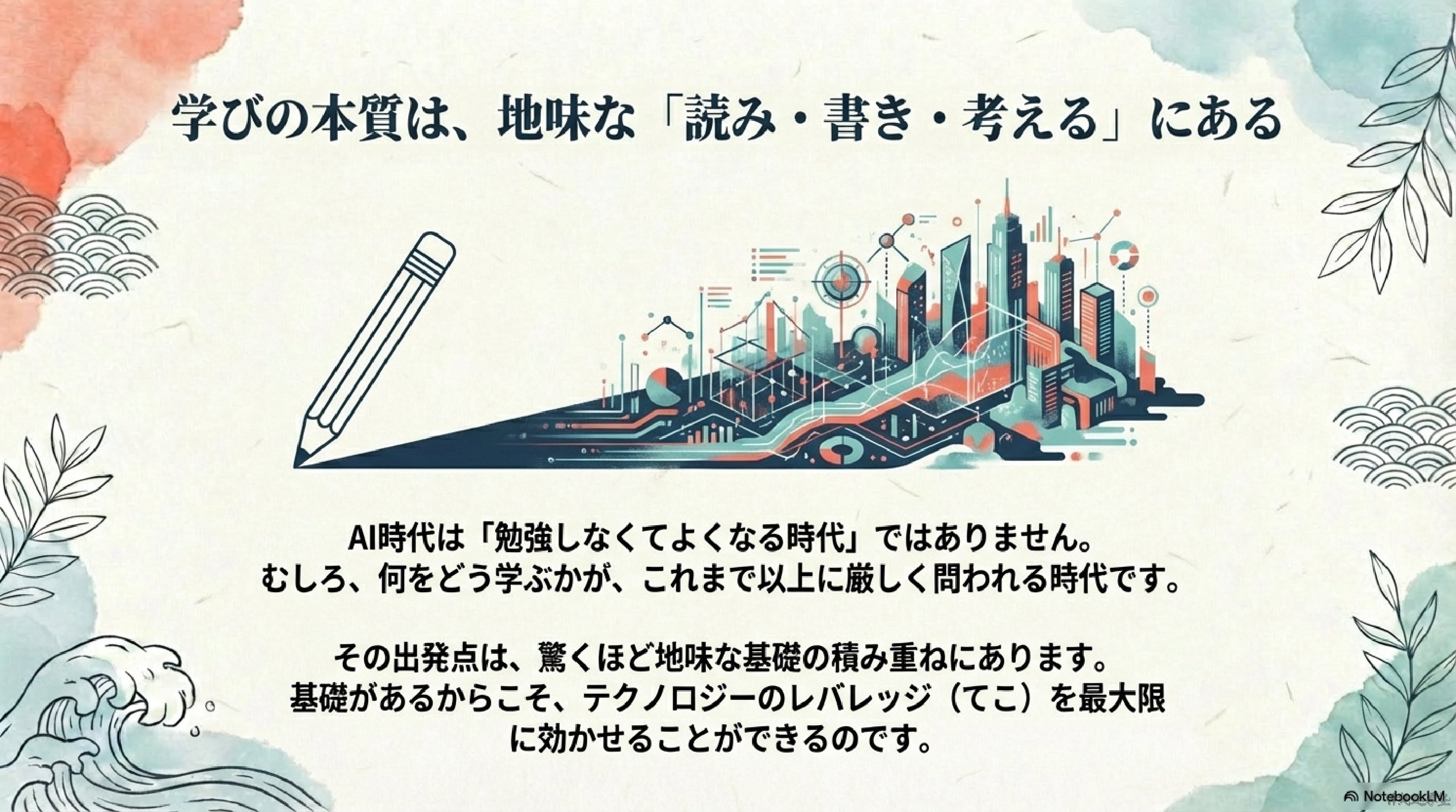 AI時代は「勉強しなくてよくなる時代」ではありません。むしろ、何をどう学ぶかが、これまで以上に問われる時代です。そしてその出発点は、驚くほど地味な「読む・書く・考える」という基礎にあります。