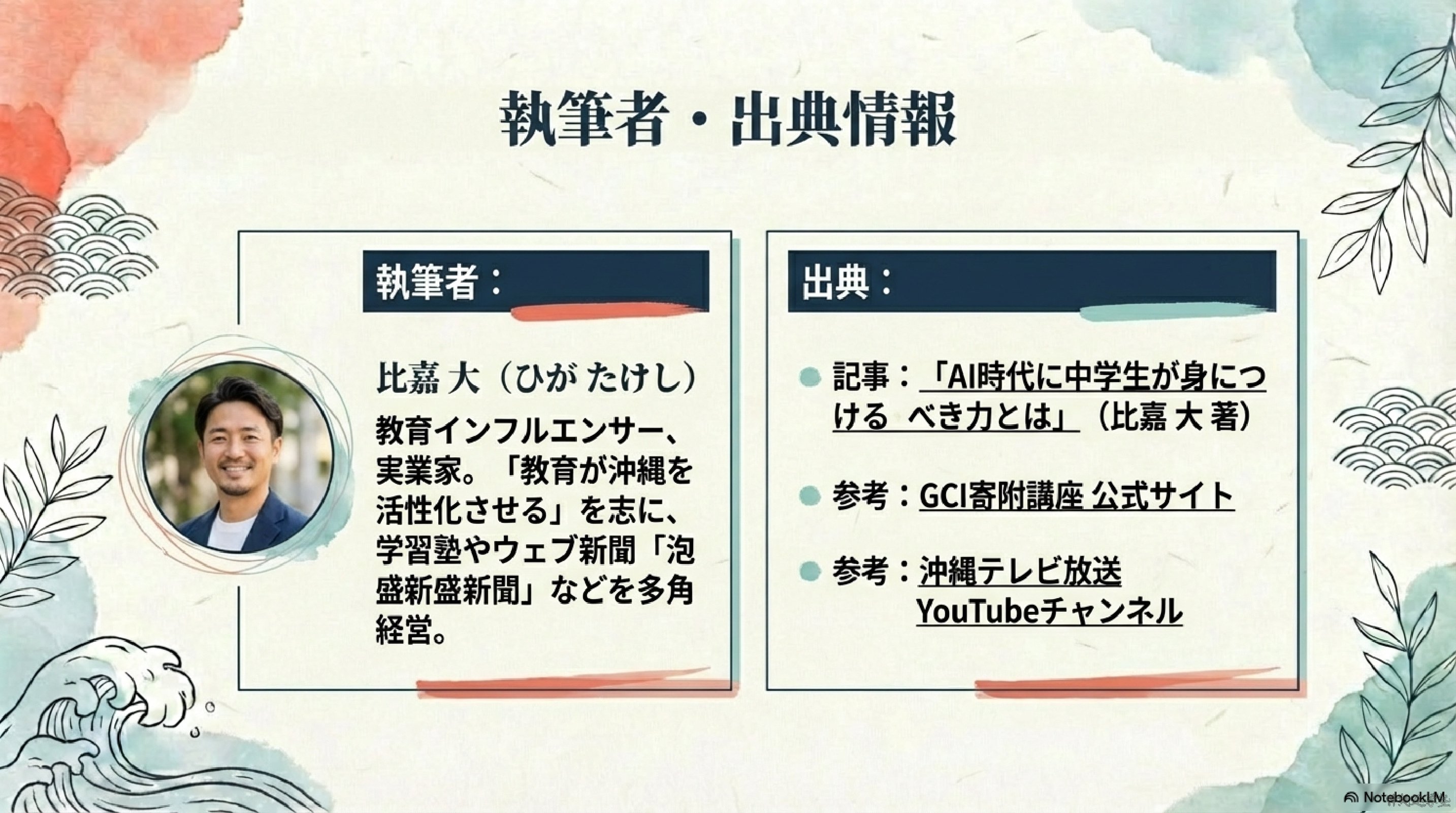 沖縄県を拠点に、中学受験・高校受験に関する情報発信を行う教育インフルエンサー。講師歴20年以上。学習塾の運営のほか、調剤薬局、ウェブ制作会社、ウェブ新聞「泡盛新聞」の経営など、25歳で起業して以来、自社7社・間接経営補助10社を展開。「教育が沖縄を活性化させる」という志を持ち、地域学力や家庭教育の課題について積極的に発言している。