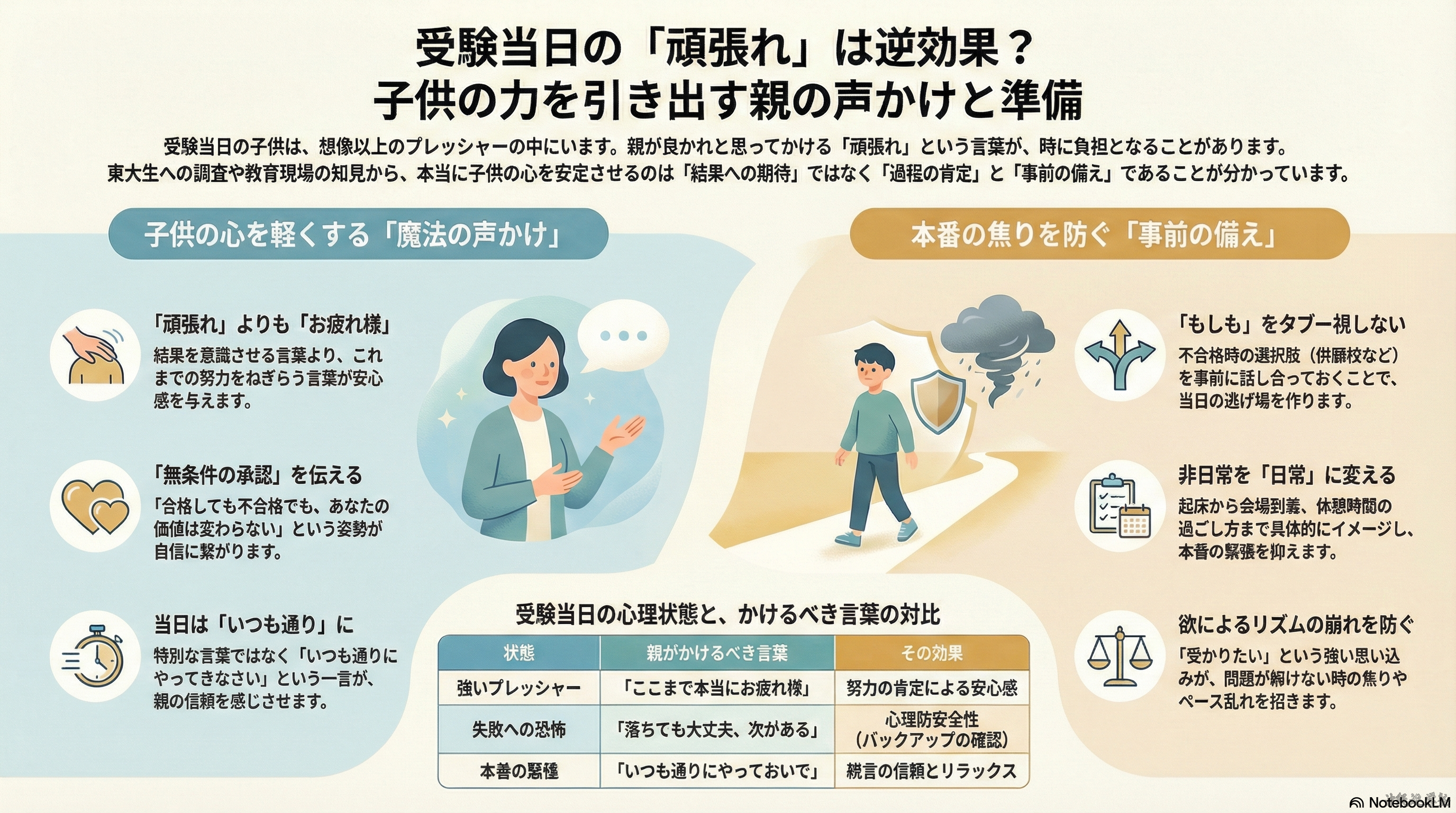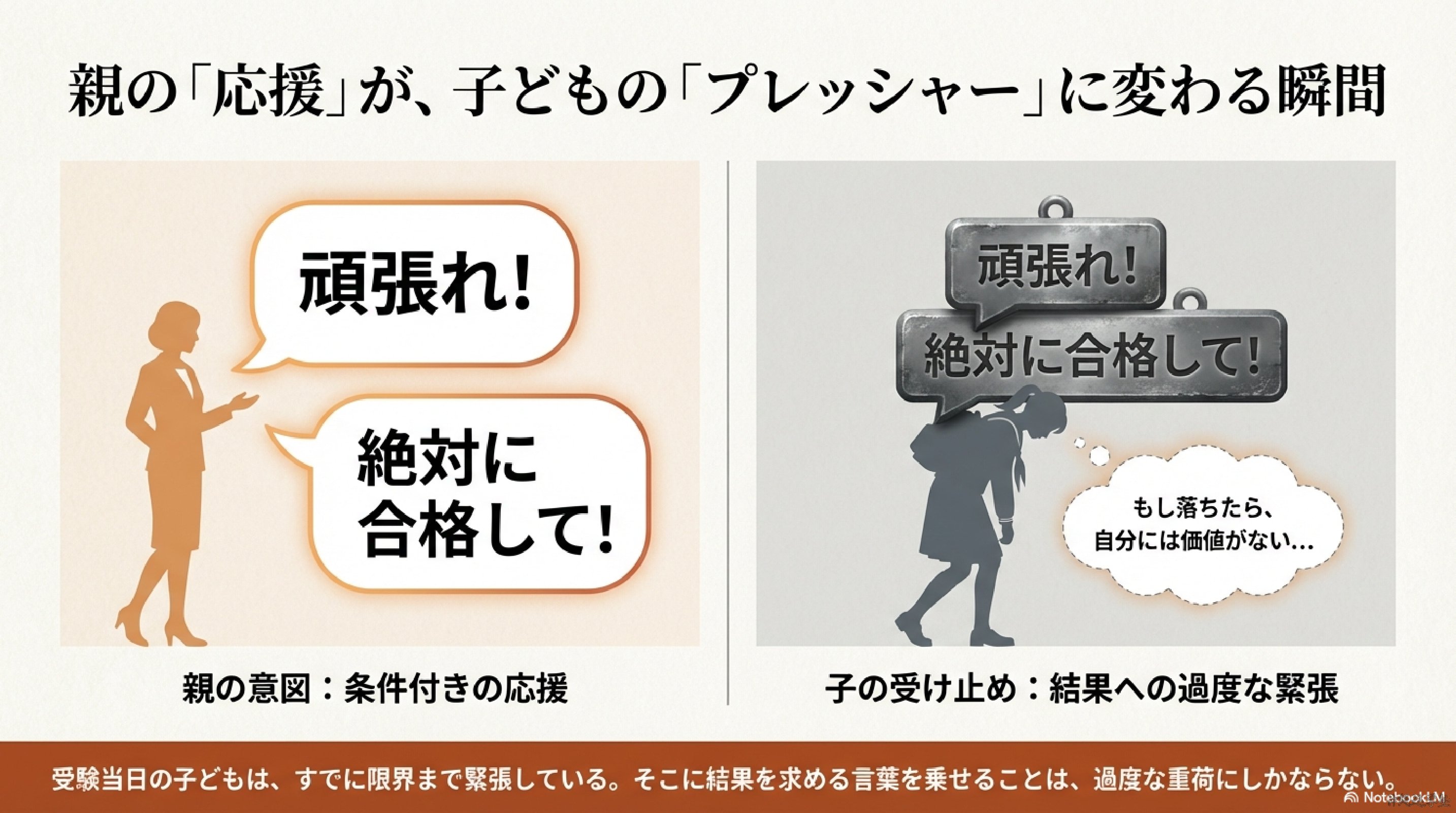 「頑張れ」や「受かれ」といった結果に焦点を当てる言葉は、すでにプレッシャーを抱えている受験生にとって負担になり得ます。そこで、合否に触れず、過程(努力)を肯定する言葉をかけることが、子どもの心を安定させ、力を出し切りやすくする――というのが記事の主な趣旨です。