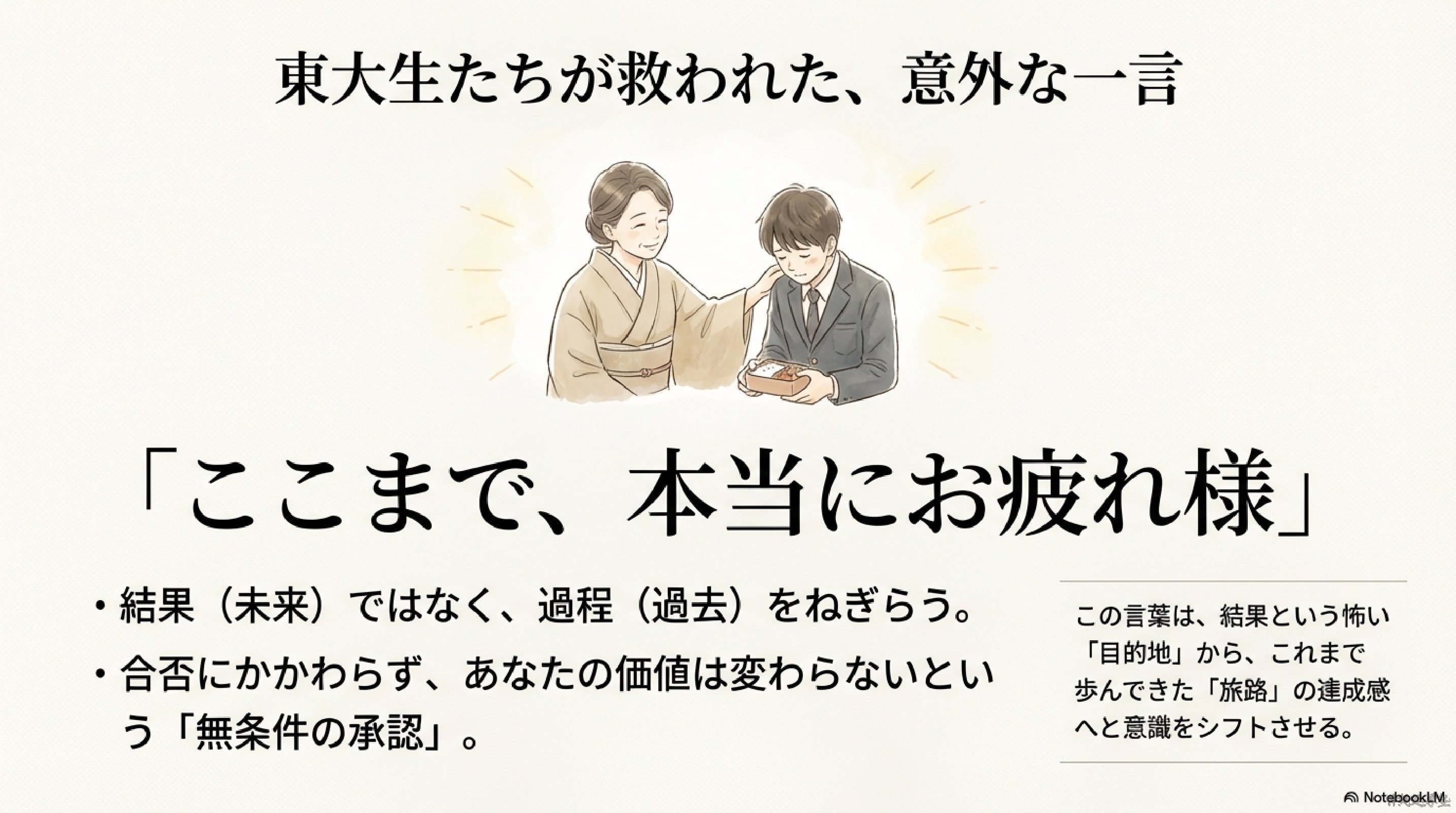 記事では、大学受験当日の朝、親が子どもにどんな言葉をかけるべきかという悩みに対し、「これを言えば必ずうまくいく」という万能な正解はないとしたうえで、多くの東大生が心が軽くなったと振り返る言葉として、「とにかく、ここまでお疲れ様」がよく挙がったことを紹介しています。