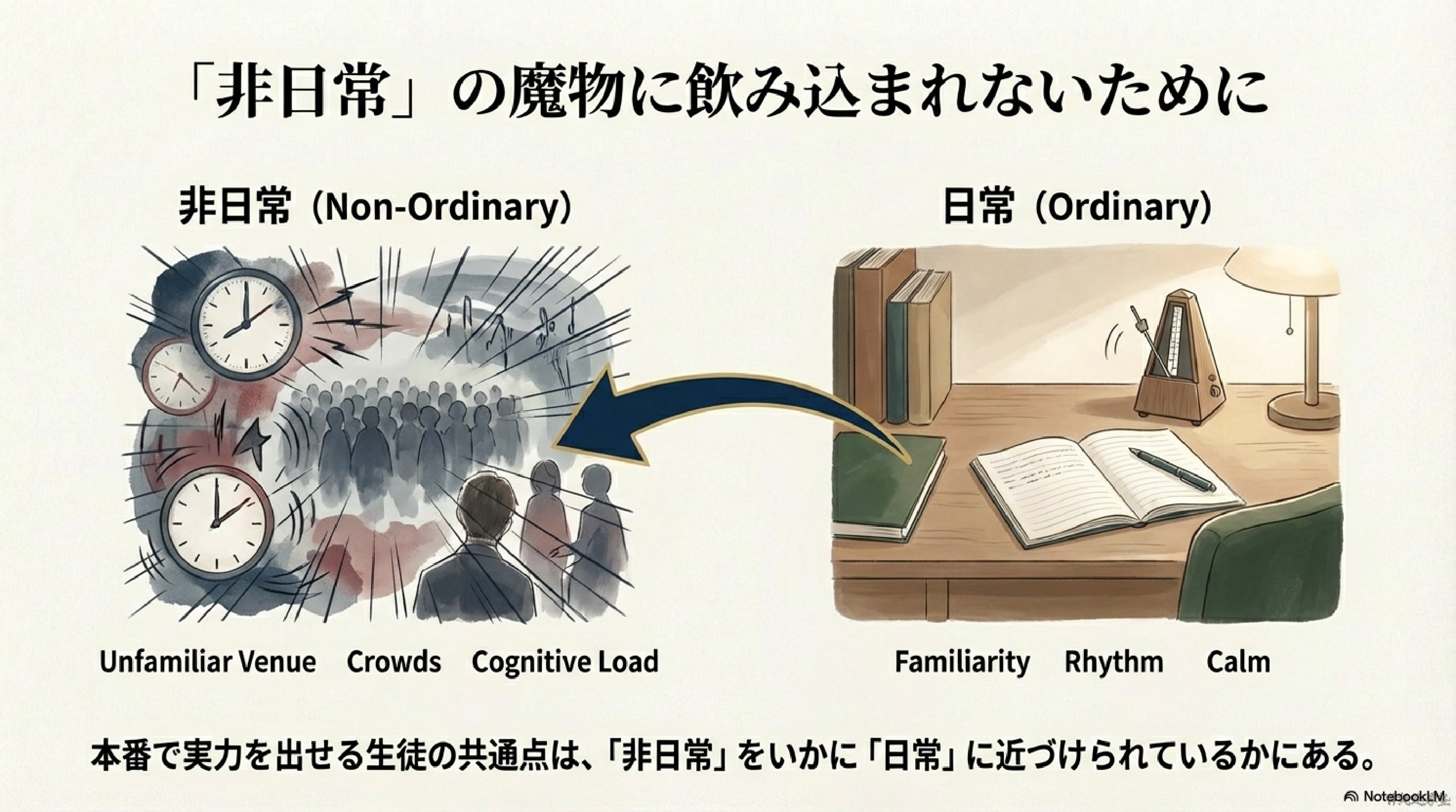 受験は、会場も空気も時間の流れも、普段とは違う非日常です。環境が変わると、人は思考の負担(にんちふか:考えるのに必要な力や余裕)が増え、普段通りに動けなくなることがあります。