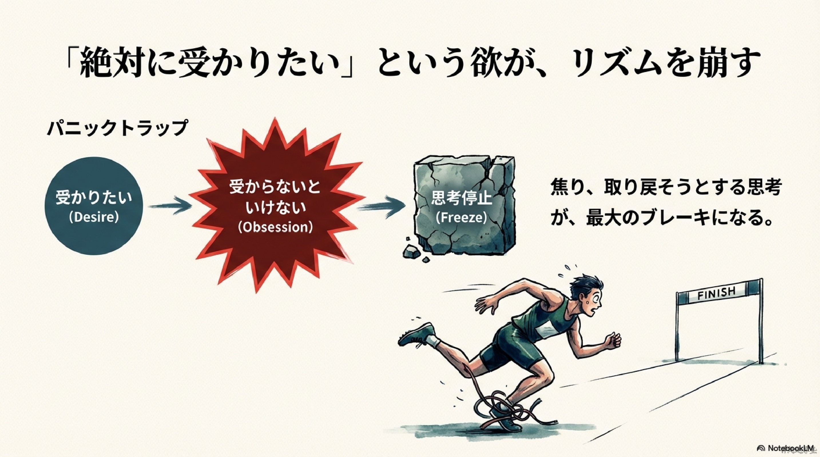 「受かりたい」「落ちたくない」という気持ちは自然です。しかしその気持ちが強すぎると、強迫観念(きょうはくかんねん:〜しなければならないと自分を追い込む考え)になり、問題を解くリズムが狂うことがあります。