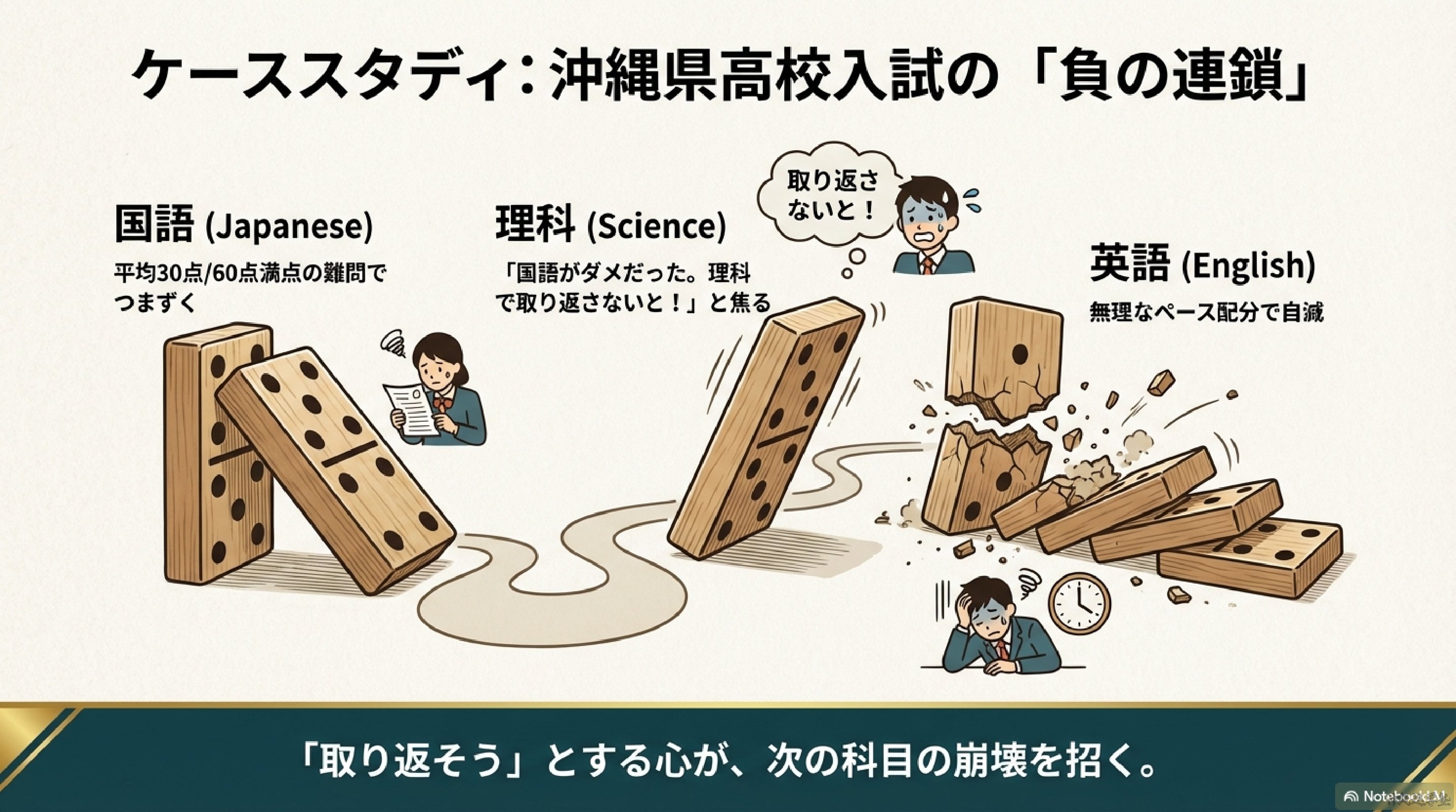 「国語がうまくいかなかった。理科で取り返さないと。英語で挽回しないと。」こうして、できなかった問題を補おうとして焦り、結果的に次の科目でもリズムを崩してしまう。これは現場で何度も見てきたパターンです。