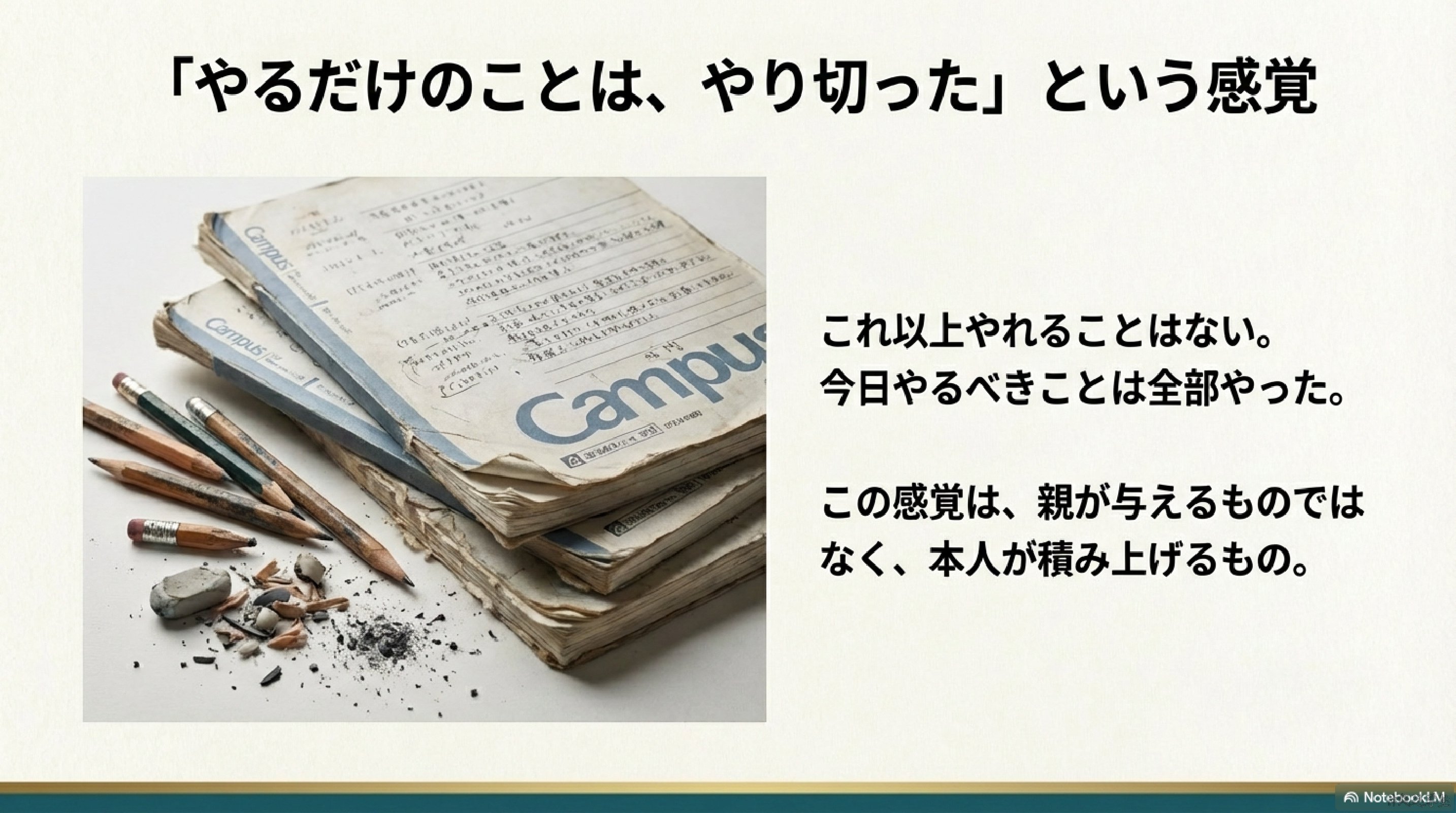 もう一つ大切なのは、本人の中に「やれるところまでやり切った」という感覚があるかどうかです。これは誰かが与えられるものではなく、本人が積み上げて得る自信です。