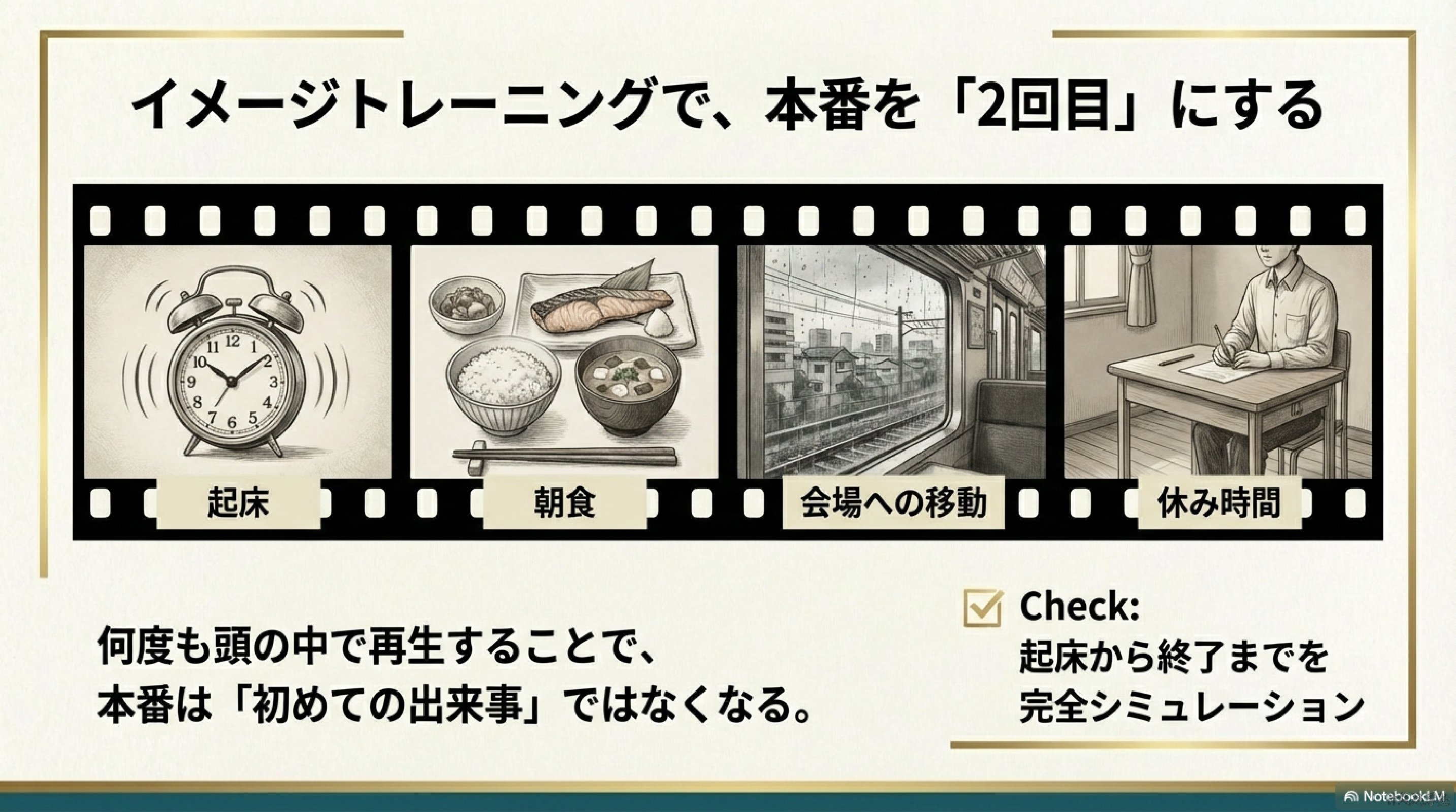 一番考えたくないことを先に考えておくと、当日は「最悪のケース」への恐怖が薄れます。恐怖が薄れると、切り替えが早くなり、結果として実力を出しやすくなります。