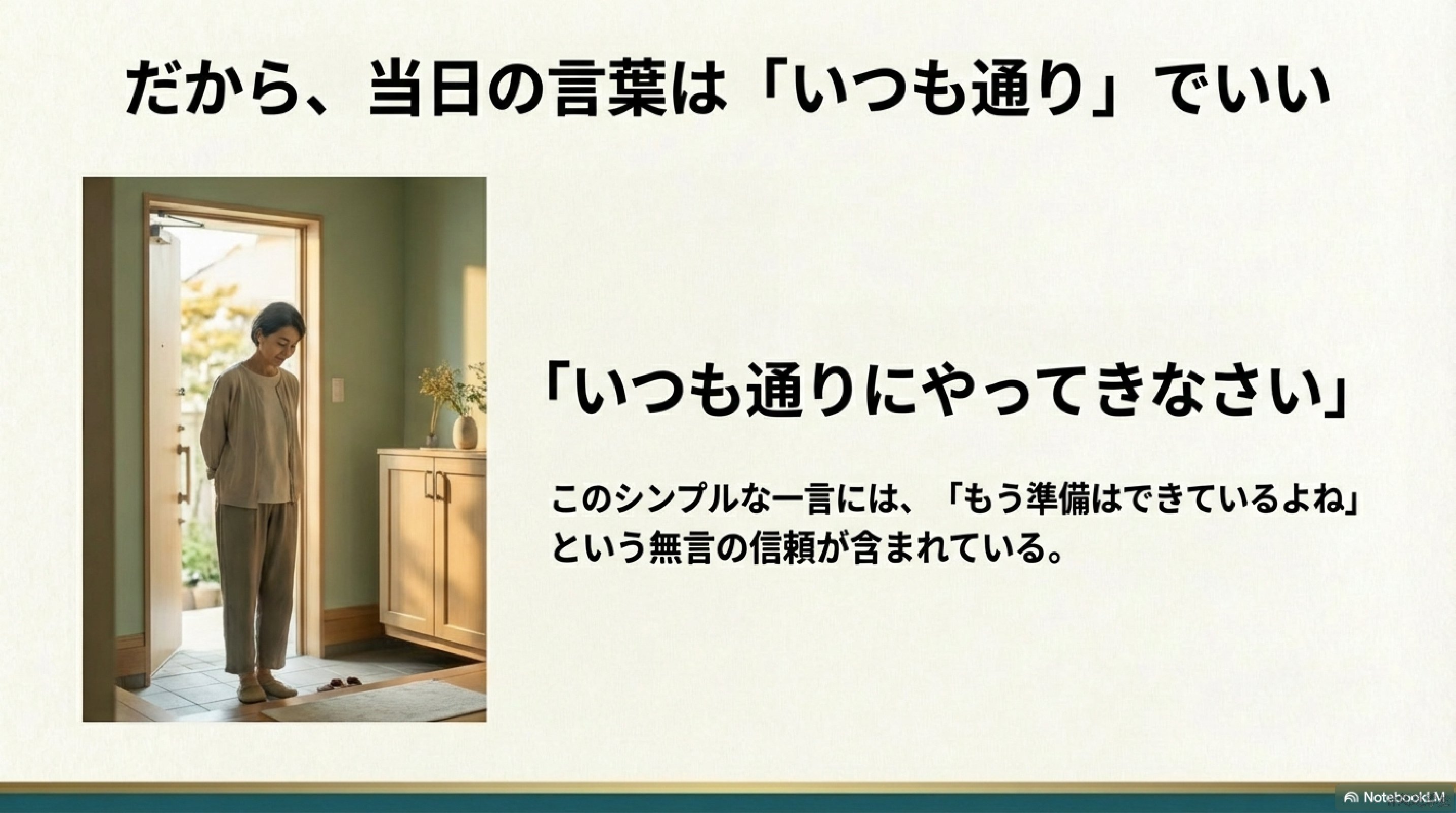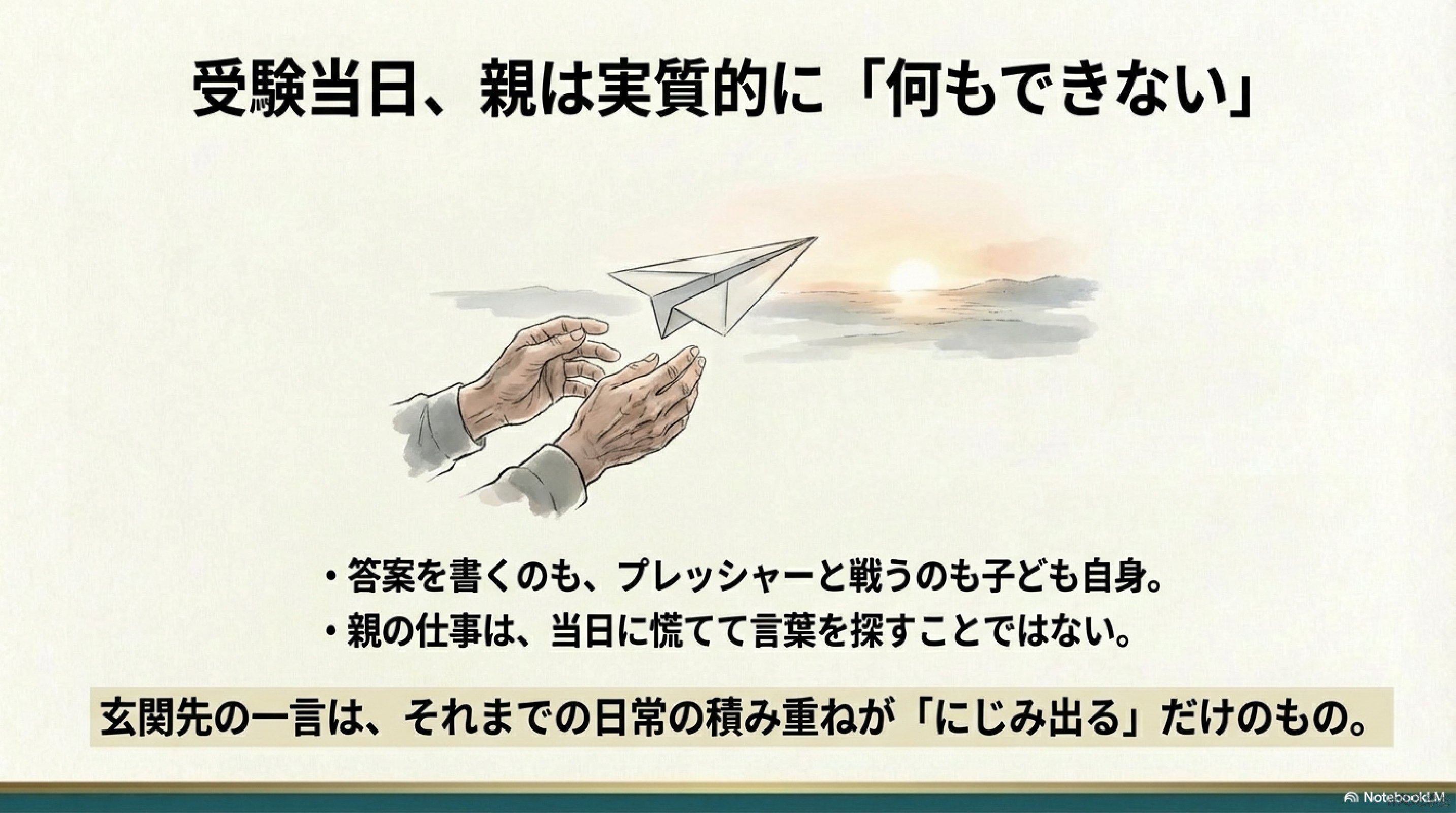 その積み重ねが、玄関先の一言ににじみ出ます。受験当日だけの“特別な言葉”より、日々の会話の延長線上にある“日常に戻す言葉”のほうが、子どもを落ち着かせるはずです。