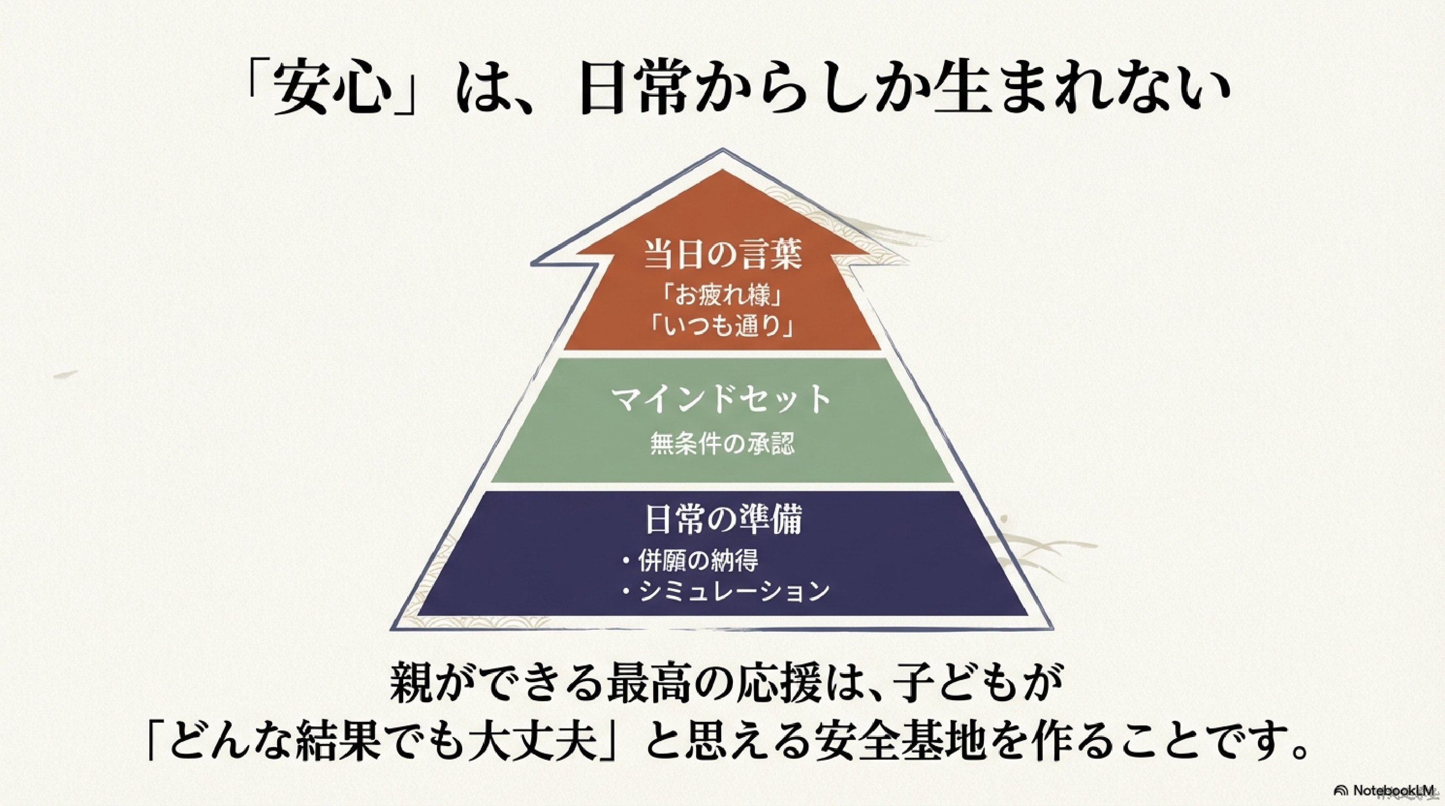 親ができる最大の役割は、「条件付きの応援」ではなく、「無条件の承認」を示すこと。つまり、結果がどうであれ「あなたの価値は変わらない」と伝えることが、子どもを支える言葉になり続ける、と述べられています。