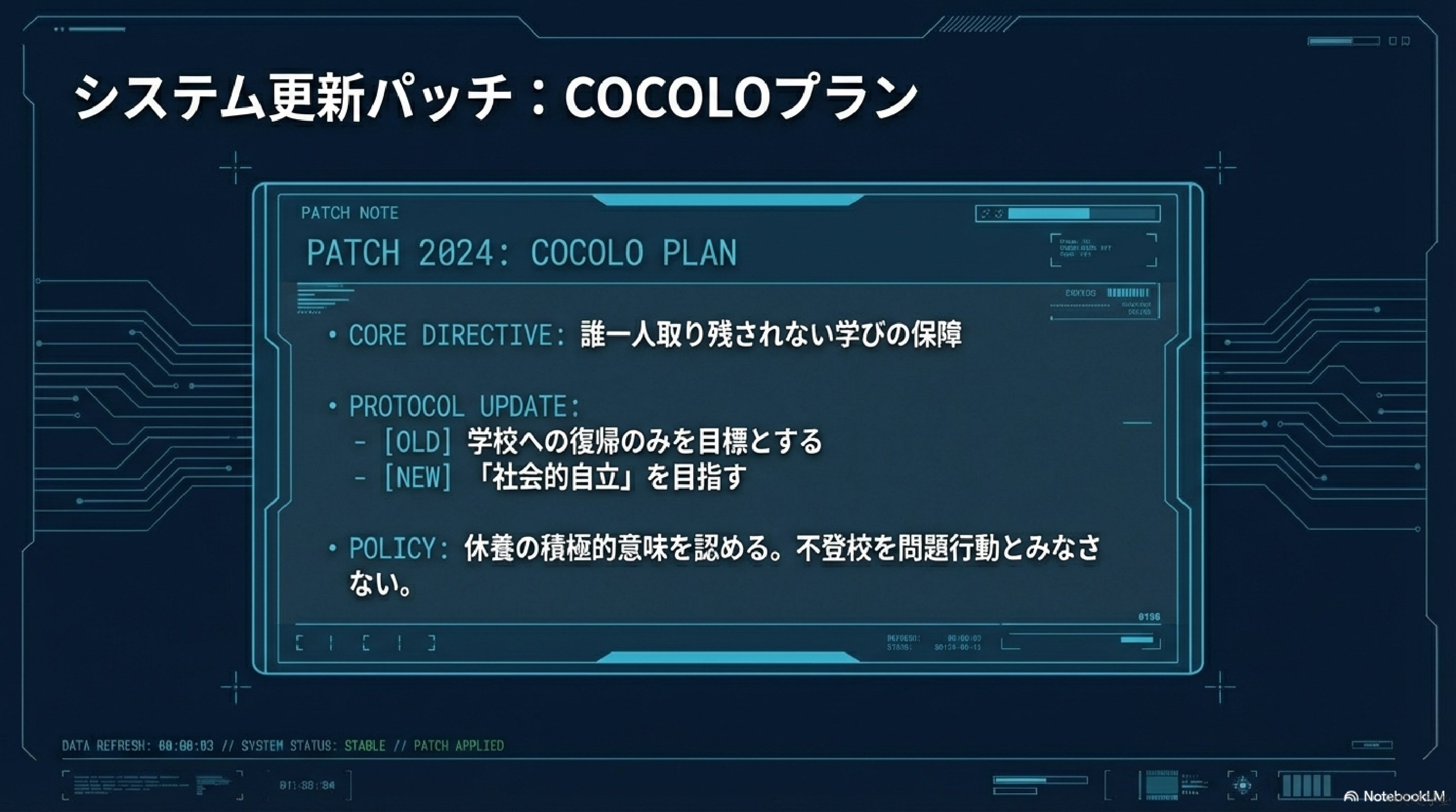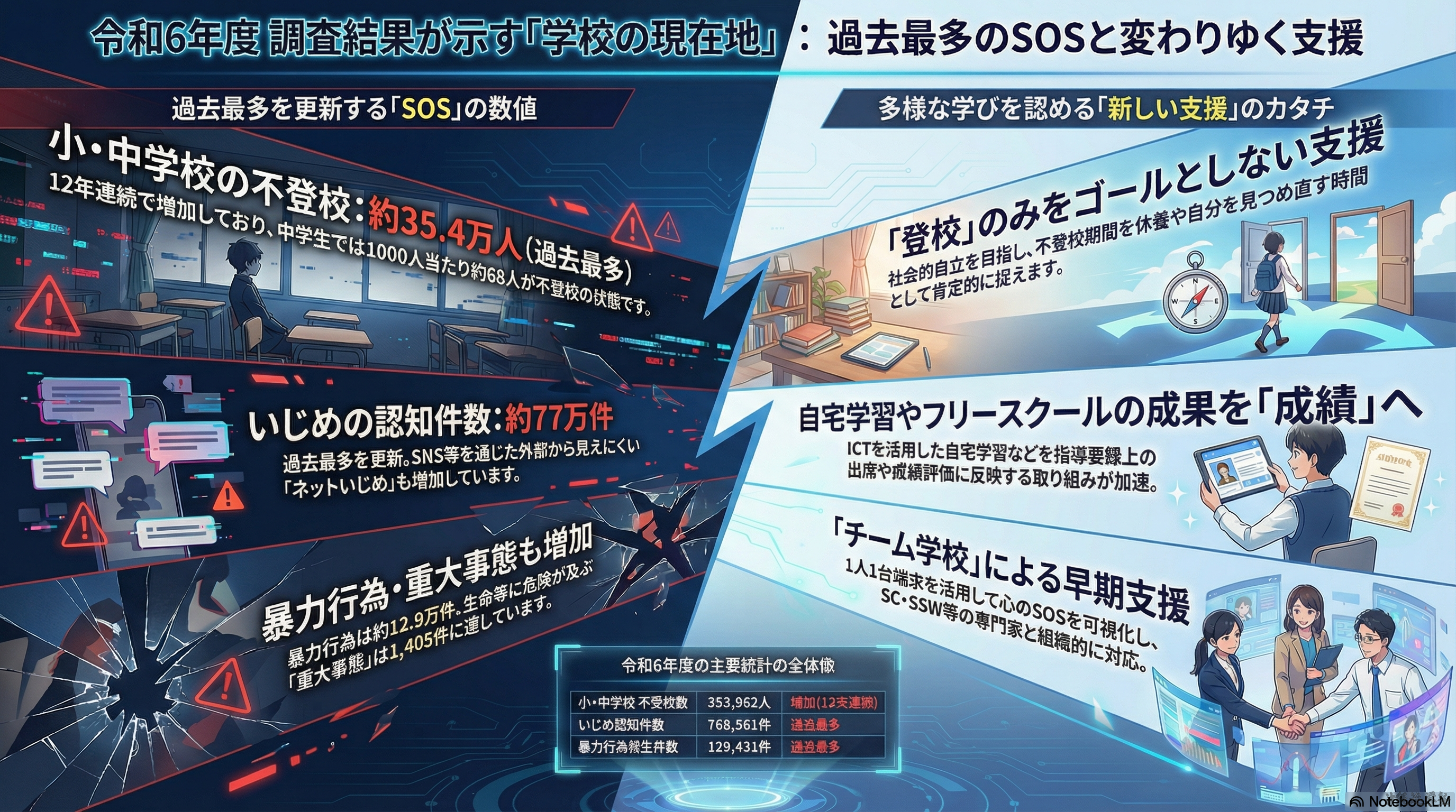 この状況を受け、同省は支援政策「COCOLOプラン」を推進し、学びの場の多様化、早期支援、保護者相談体制の強化などを進めている。政策の方向性は、従来の「登校回復中心」から「本人に適した学習環境確保」へと転換しつつある。