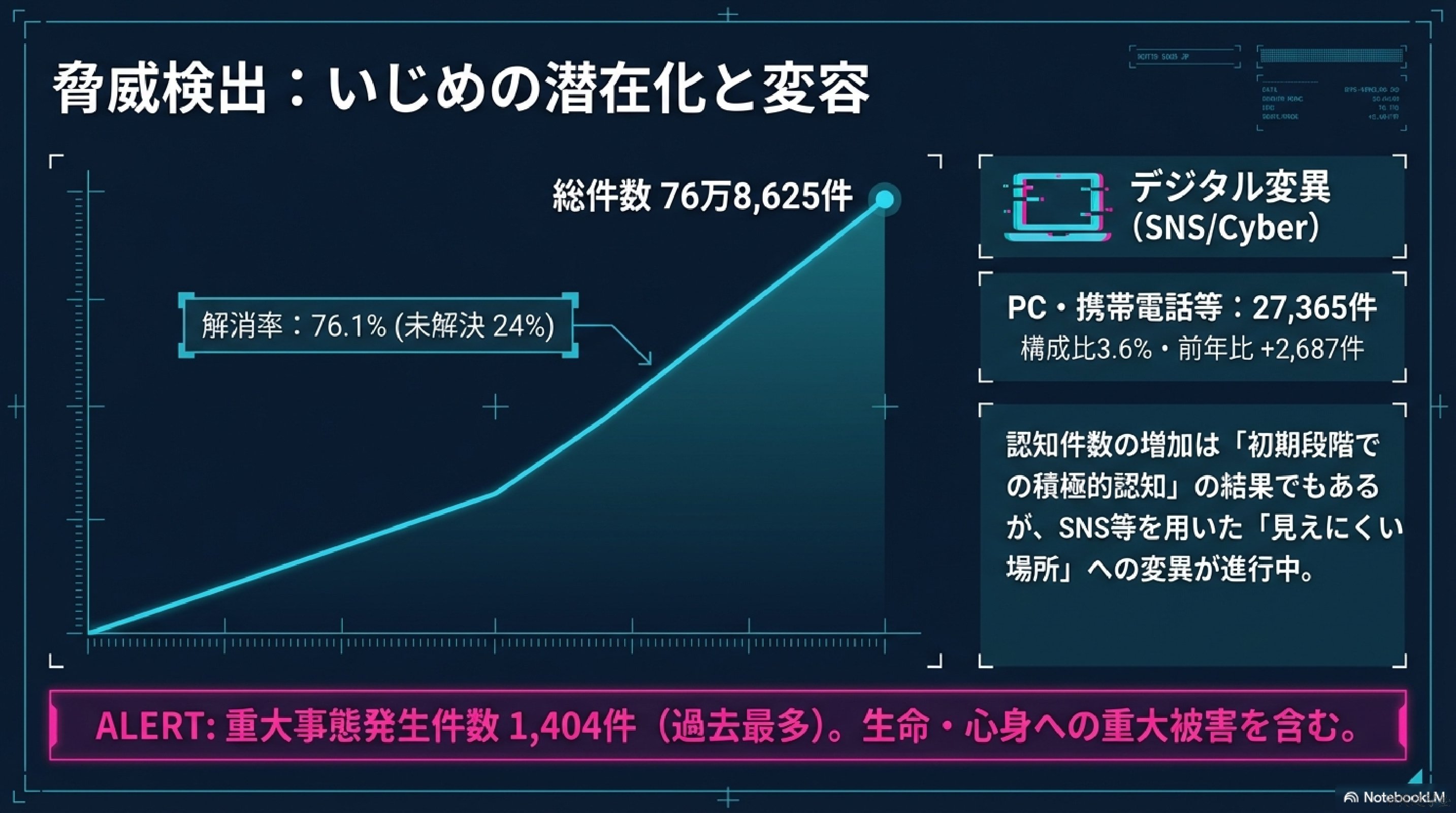 | いじめ認知件数 | 約77万件 | SNS型増加 |