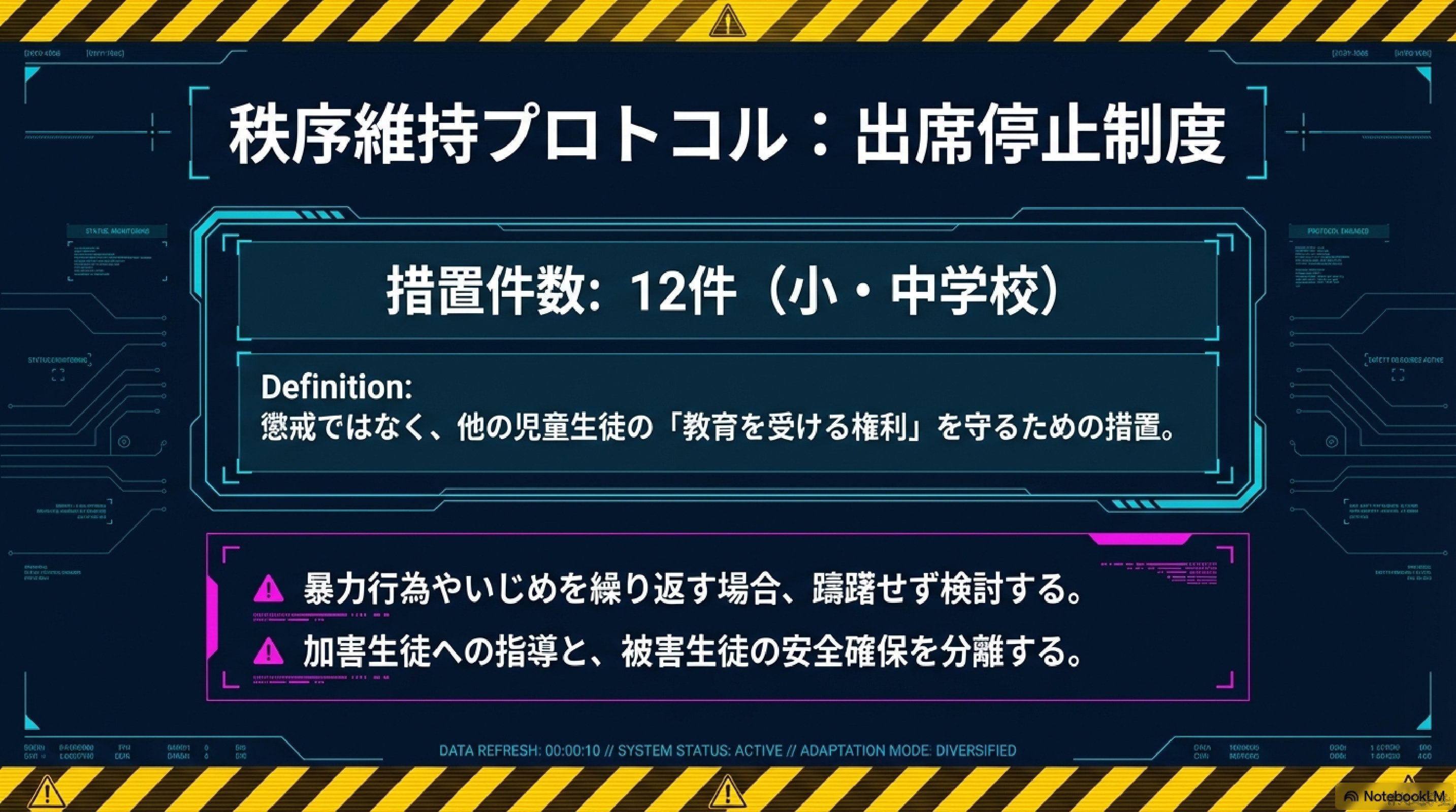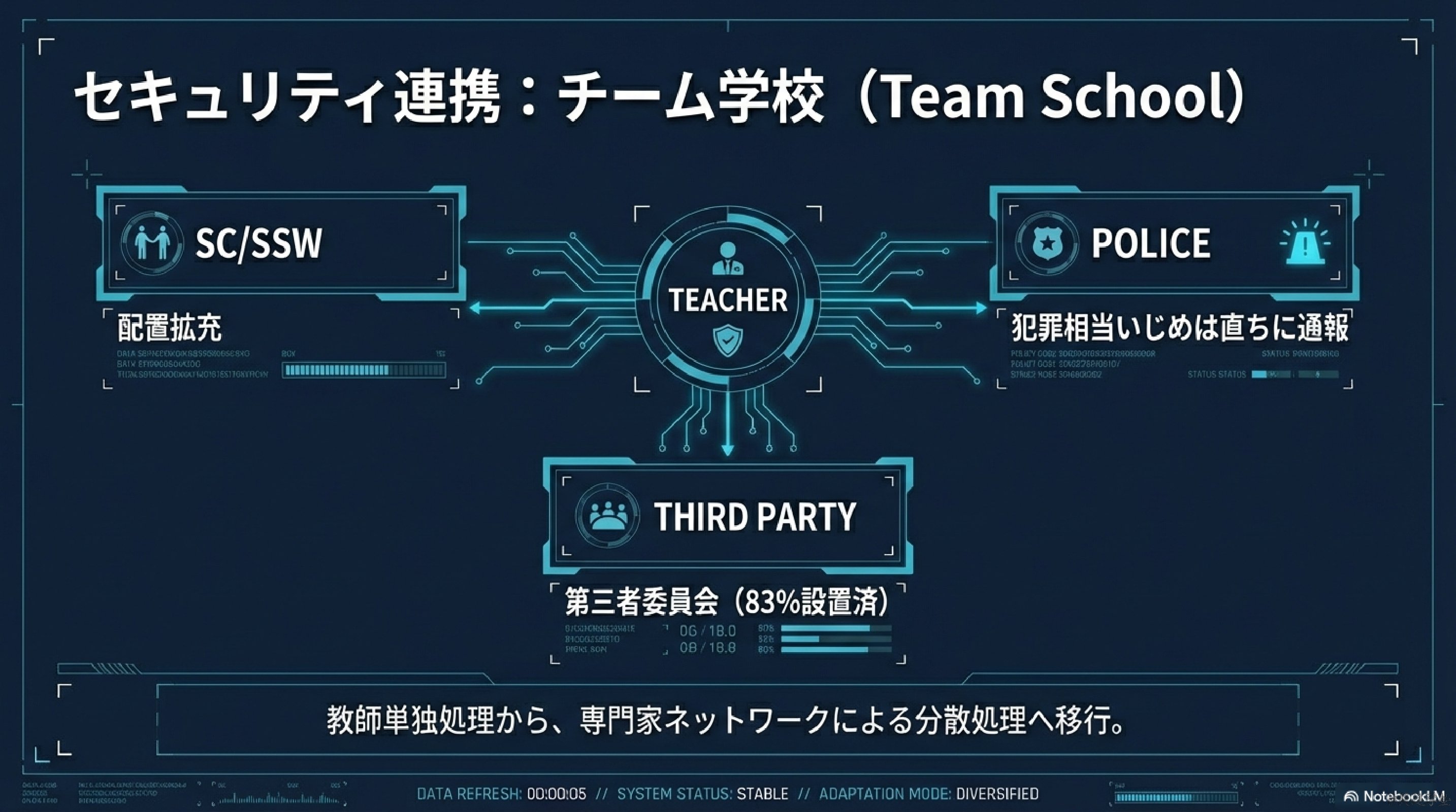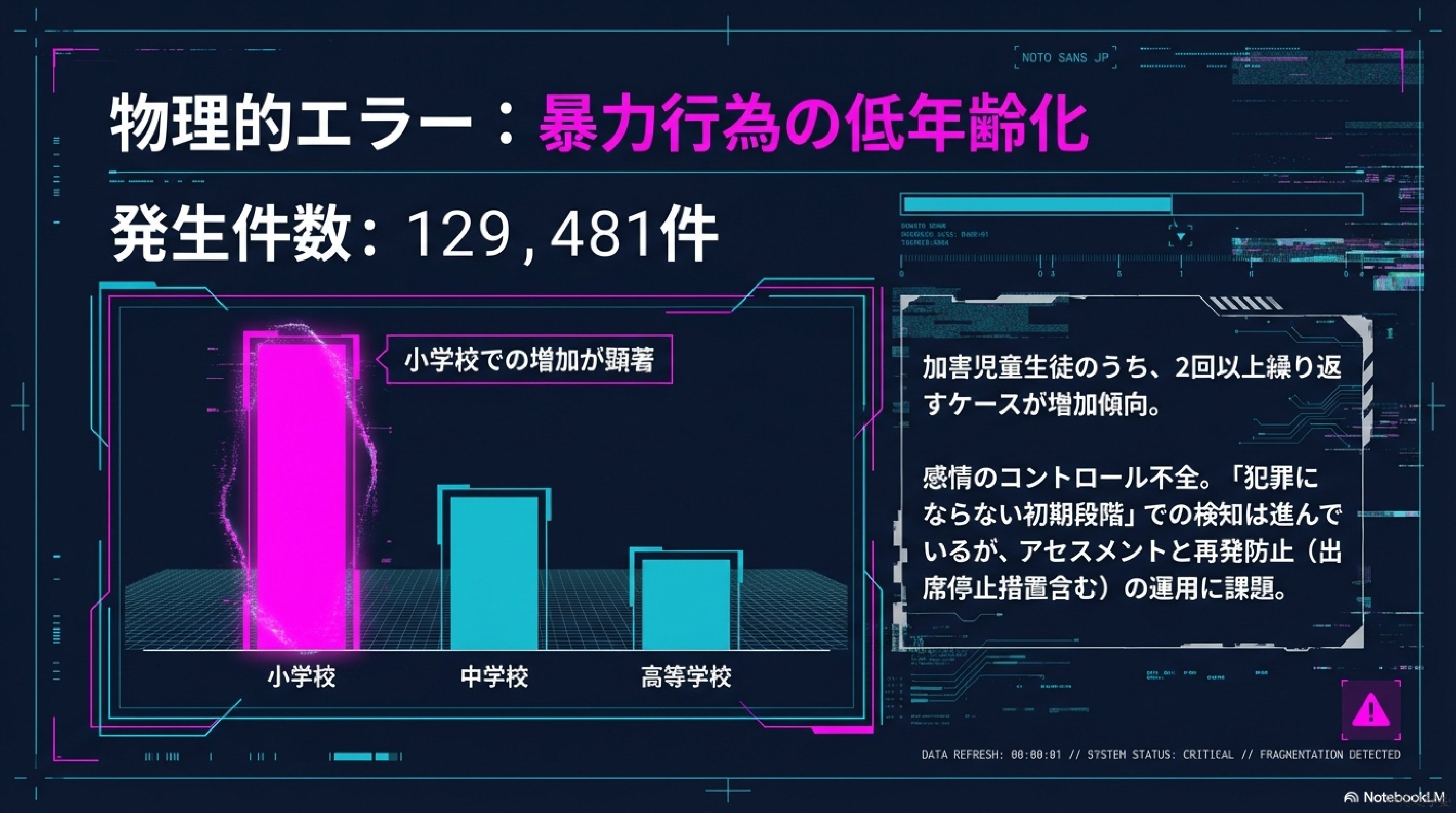 ただし全てを家庭要因に還元することはできない。いじめなど外部環境に原因がある場合、問題の所在は学校や社会構造にある。いじめ認知件数77万件という統計は、学校内人間関係の緊張度の高さを示している。