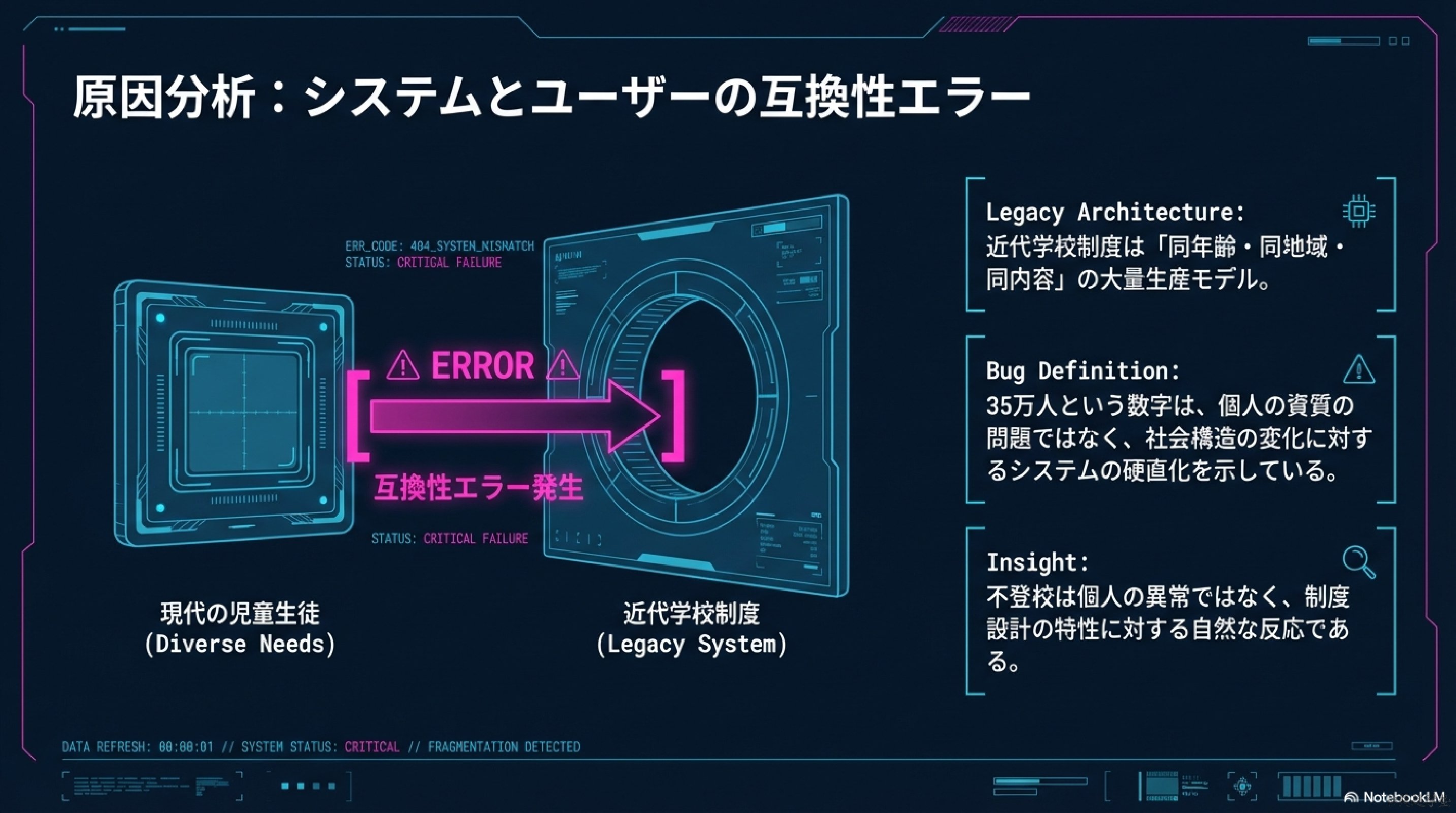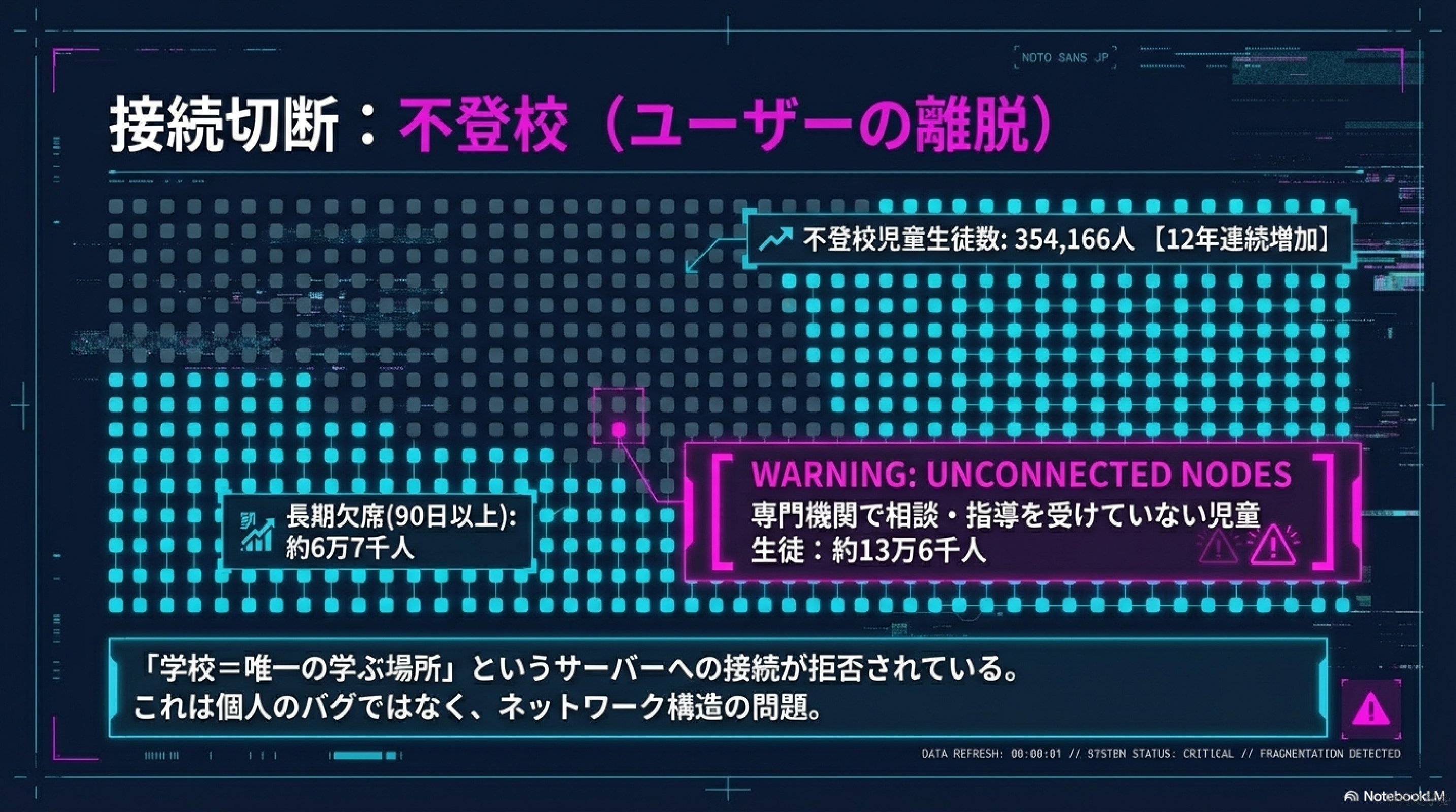 理解速度、興味関心、感受性、思考傾向が異なる子どもを同一環境に置く以上、一定数が適応困難になるのは制度上避けられない。これは個人の問題ではなく制度設計の特性である。