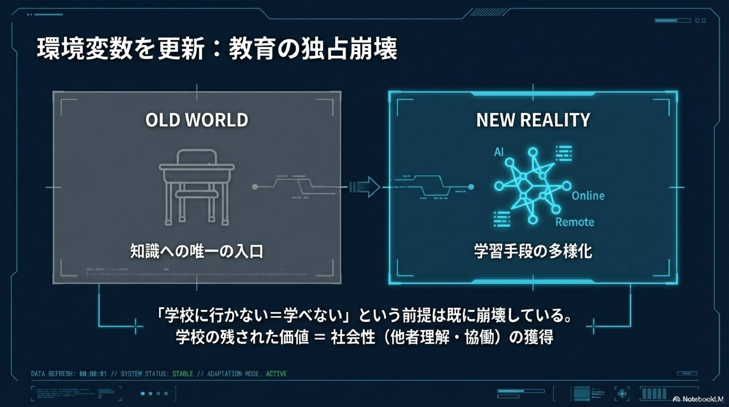 この変化は教育史的転換点と言える。学校は依然重要な教育機関ではあるが、唯一の学習経路ではなくなった。したがって「学校に行かない=学べない」という前提は、すでに現実と一致していない。