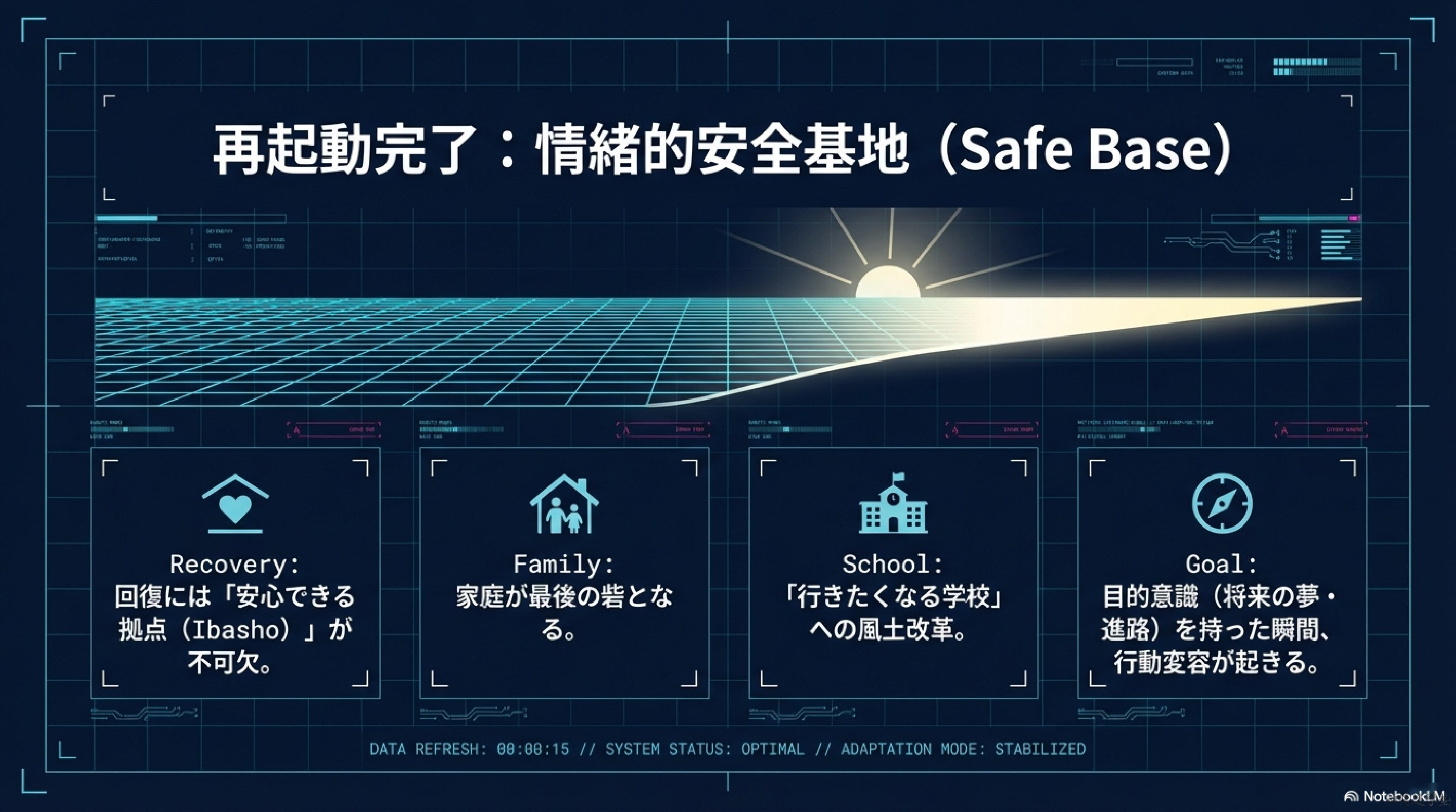 回復過程を観察すると家庭環境の影響は極めて大きい。教育心理学では、安心して戻れる場所を「情緒的安全基地(安心できる拠点)」と呼ぶ。この基地がある子どもほど心理回復力が高いことが研究で示されている。
