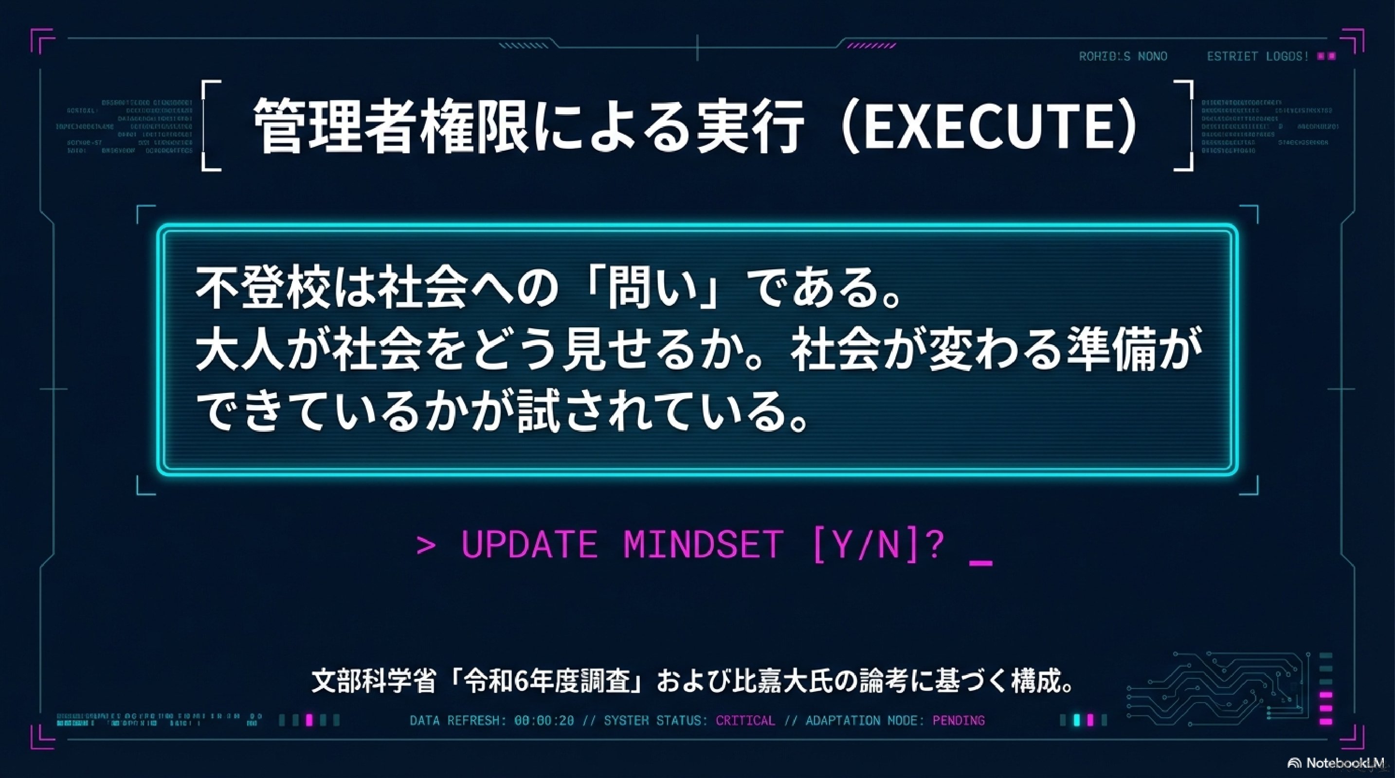 不登校という現象は、子どもの問題ではなく社会への問いかけである。社会が変わる準備ができているかどうか、その成熟度が試されている。