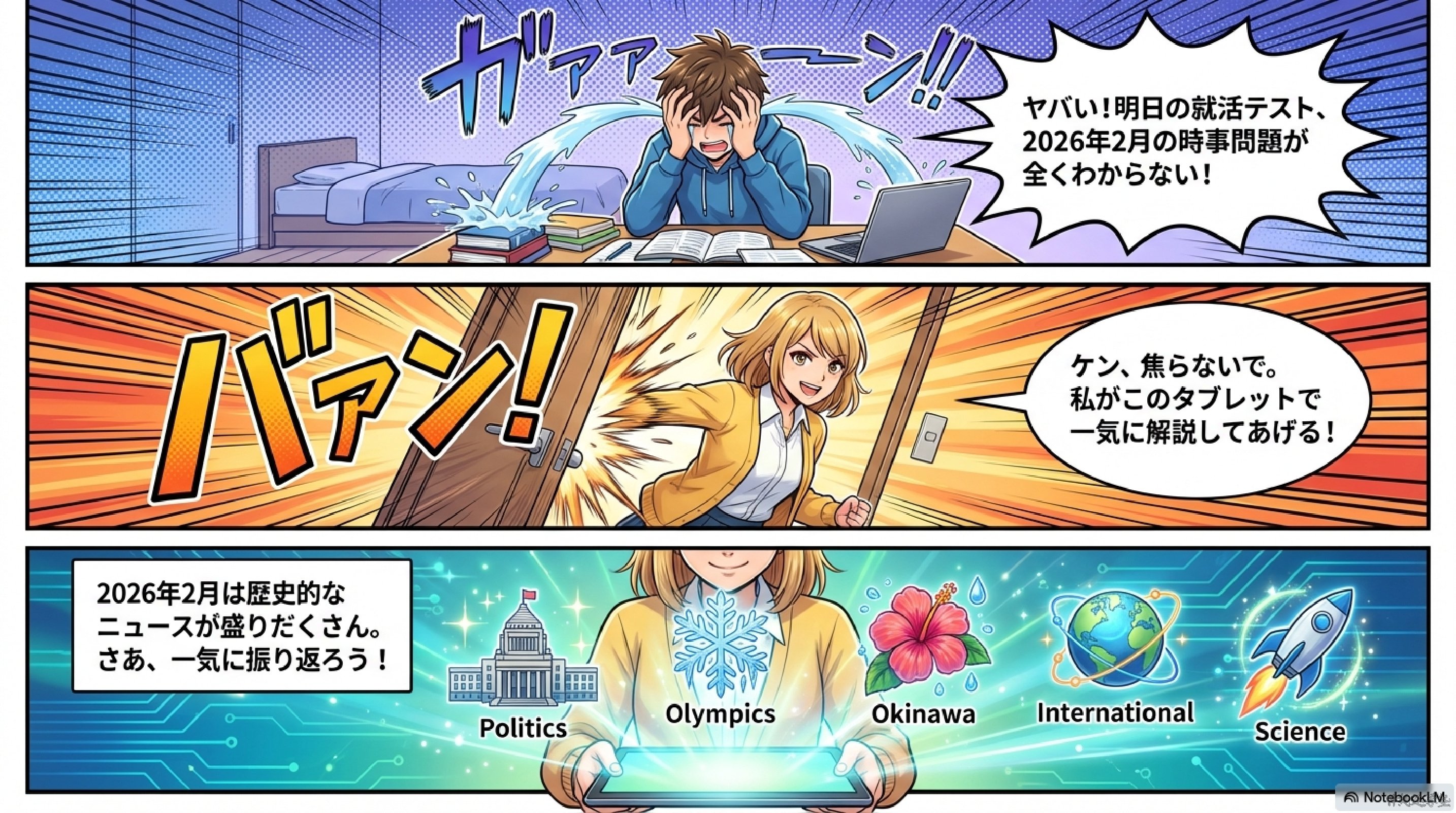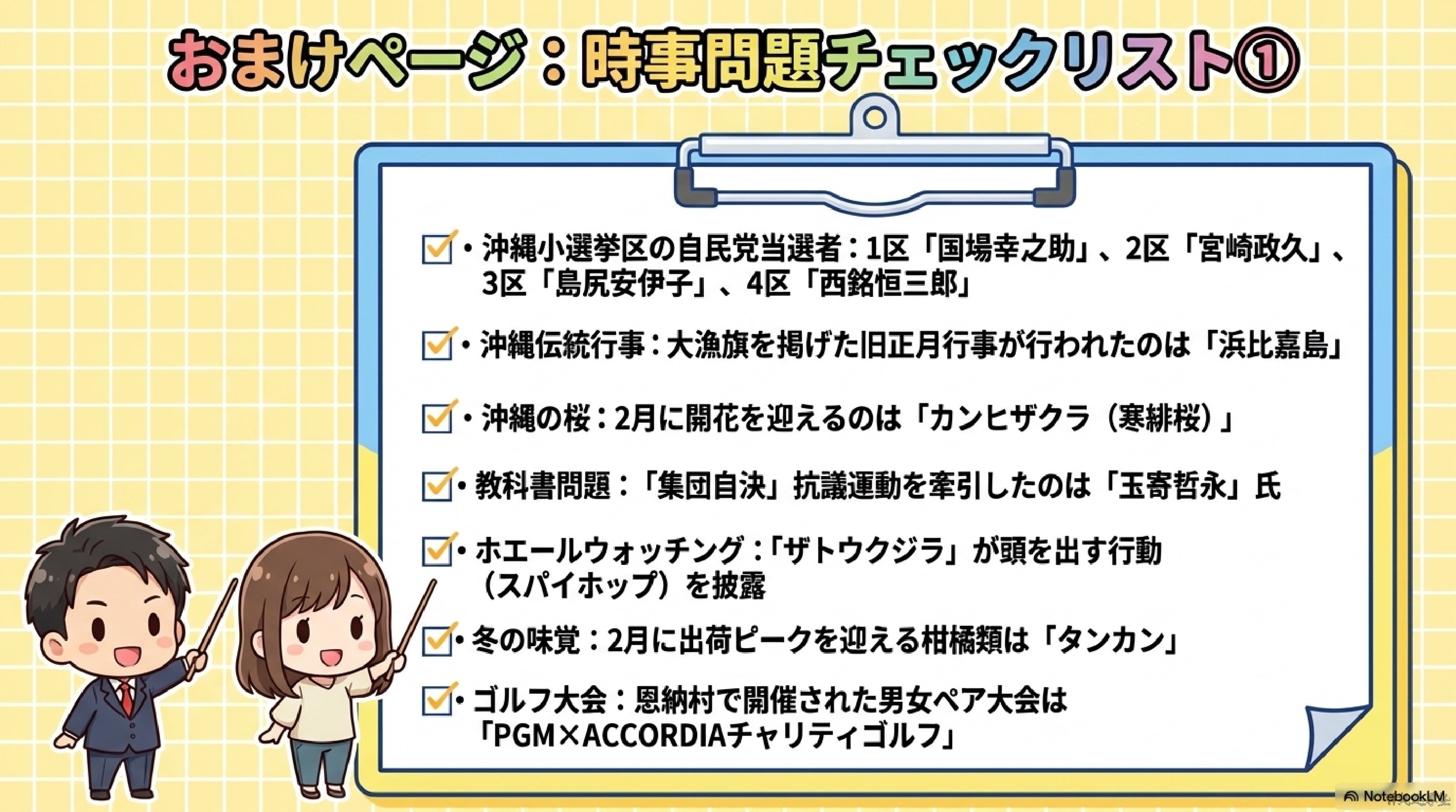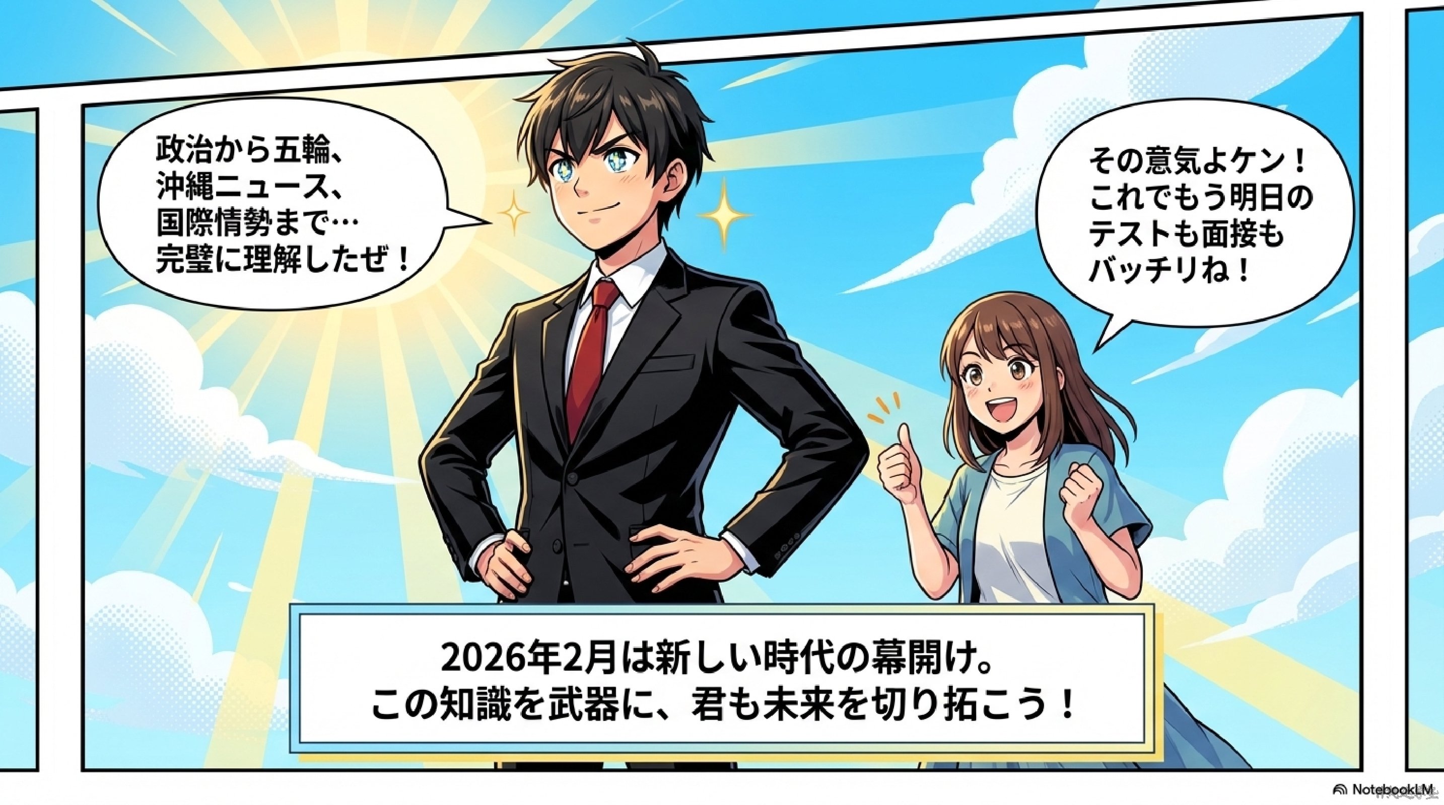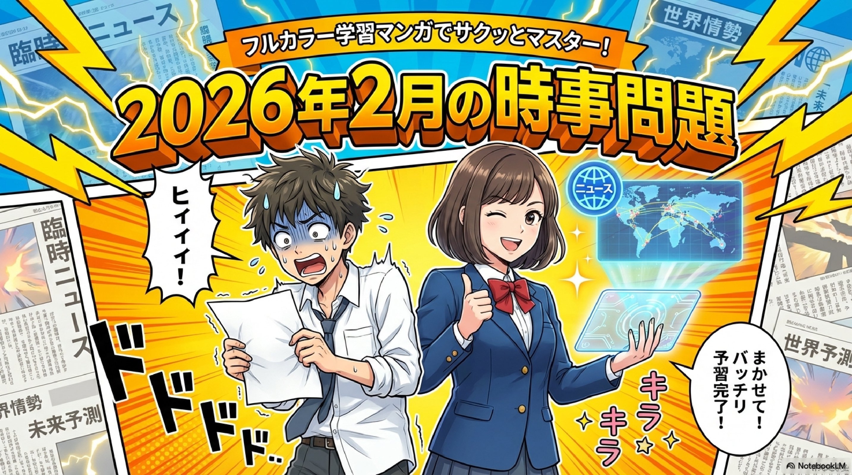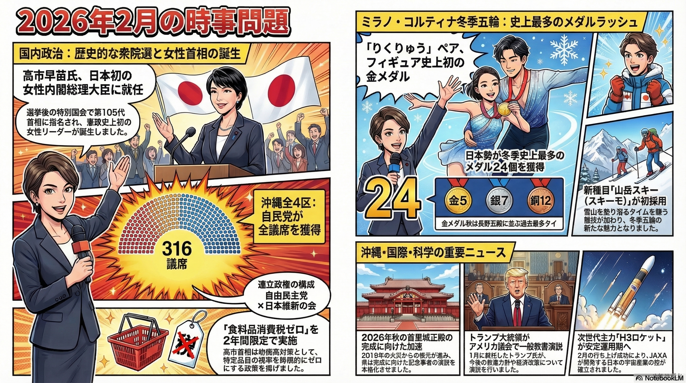 2026年2月の主なニュースを60問の時事問題として整理した記事である。内容は①衆議院総選挙や高市早苗首相誕生などの政治、②ミラノ・コルティナ冬季五輪での日本選手の活躍、③PFAS問題や首里城復元、プロ野球キャンプなど沖縄県内の出来事、④ウクライナ戦争やイラン情勢、インドとのFTAなどの国際・経済ニュース、⑤H3ロケット、藤井聡太、干支など科学・文化の話題で構成されている。国内外の重要ニュースを分野別に確認できる、中学生向けの総合的な時事学習教材となっている。