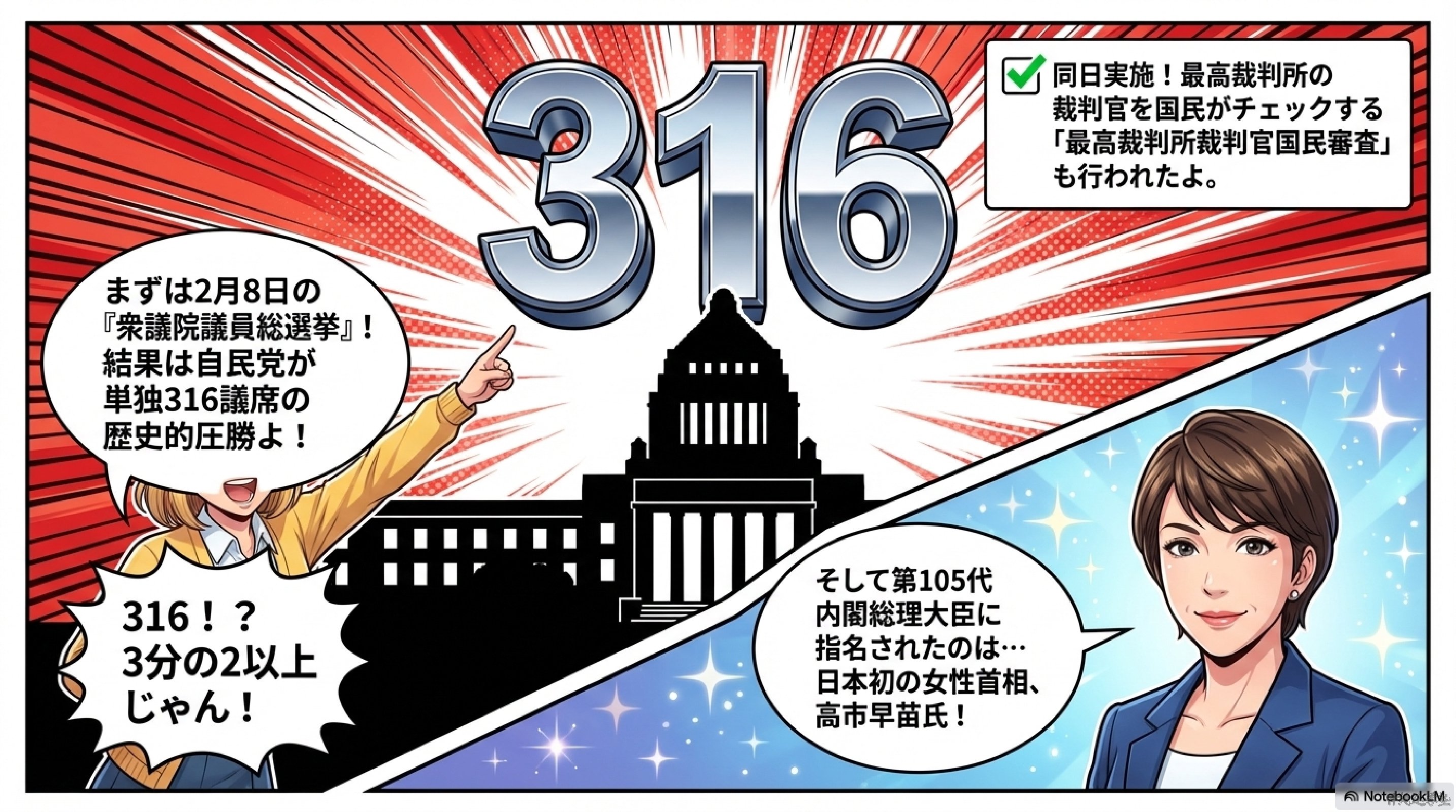 2. 今回の衆院選の結果、単独で316議席を獲得し、歴史的な圧勝を収めた政党は何ですか。