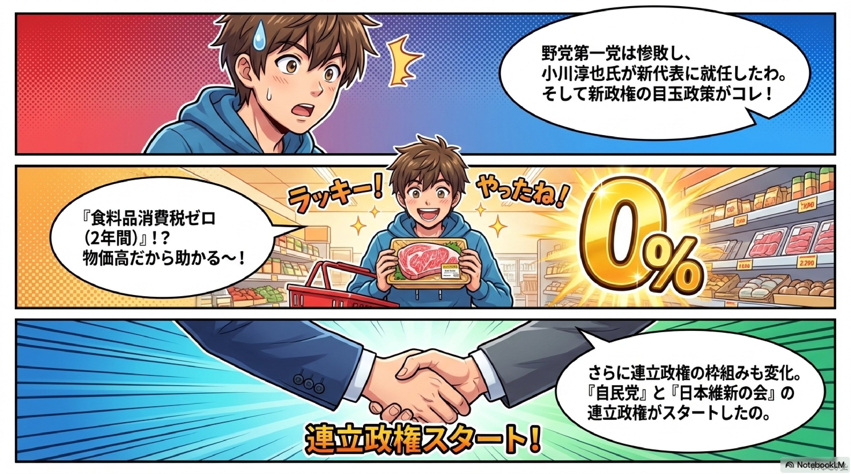 連立政権とは複数の政党が協力して政府を作ることです。以前の日本では「自民党×公明党」の連立が続いてきました。しかし今回の選挙では公明党は政権与党から離れ、日本維新の会が連立政権に加わりました。