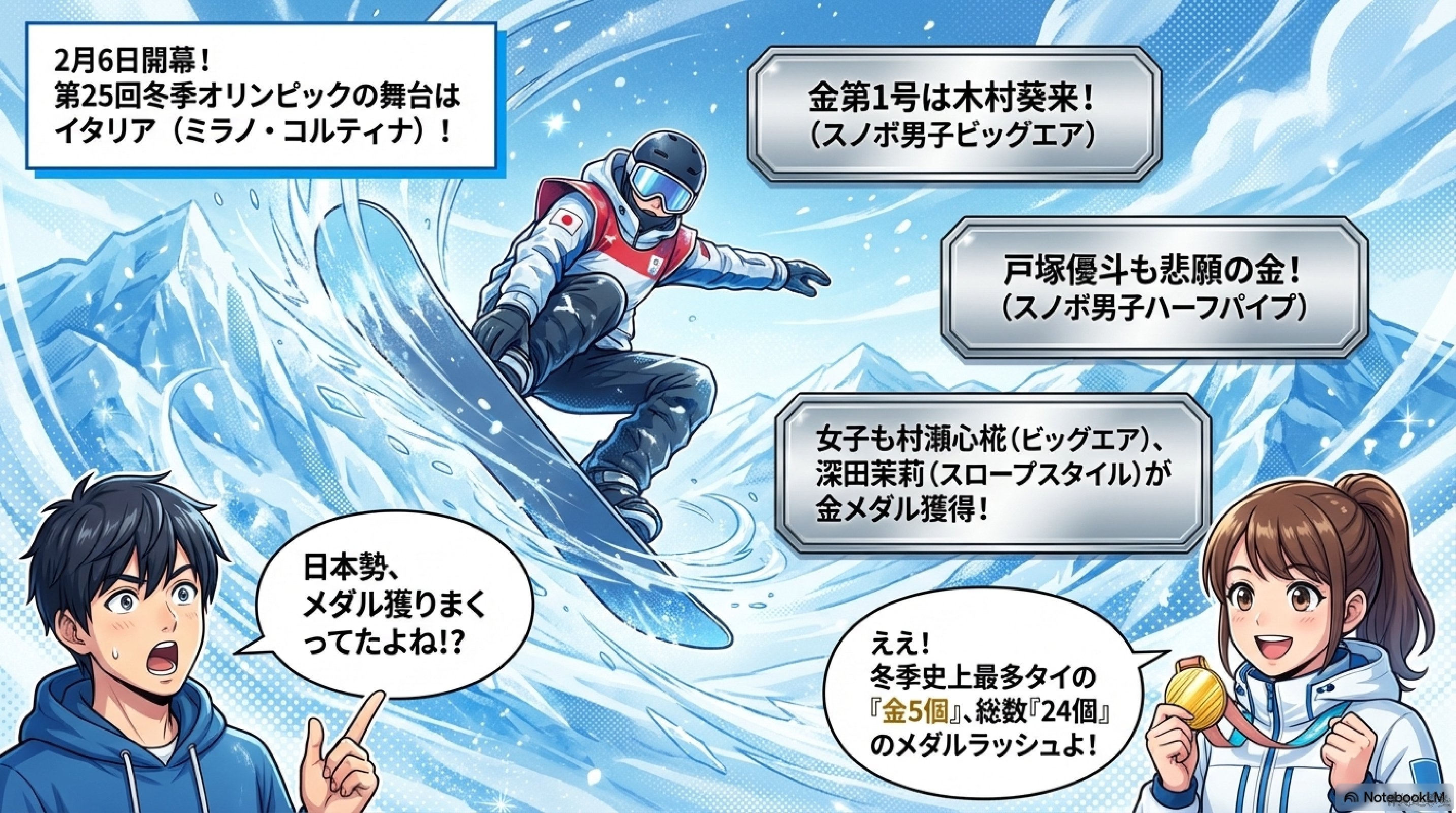 2026年冬季オリンピックで日本が獲得したメダルは合計24個でした。内訳は「金メダル 5個(冬季史上最多タイ、長野五輪と並ぶ)」「銀メダル7個」「銅メダル12個」である。これは日本の冬季五輪の歴史の中で最多のメダル数となりました。