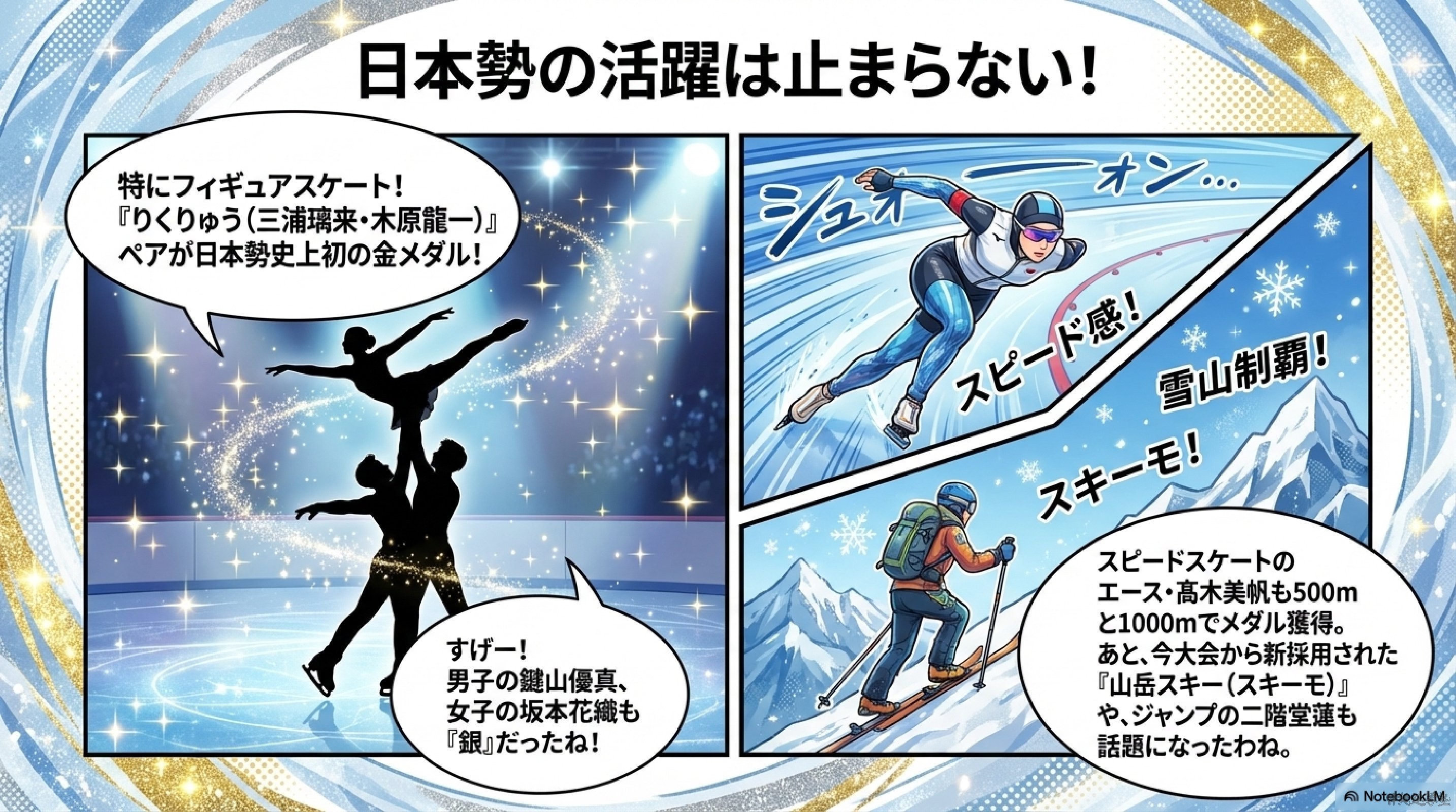 この2人はフィギュアスケートのペアで「りくりゅう」という愛称で呼ばれています。フィギュアスケートのペアでは男性が女性を持ち上げるリフト、同時ジャンプなどが評価されます。日本ではペア競技があまり強くなかったため、史上初の金メダルは大きなニュースになりました。
