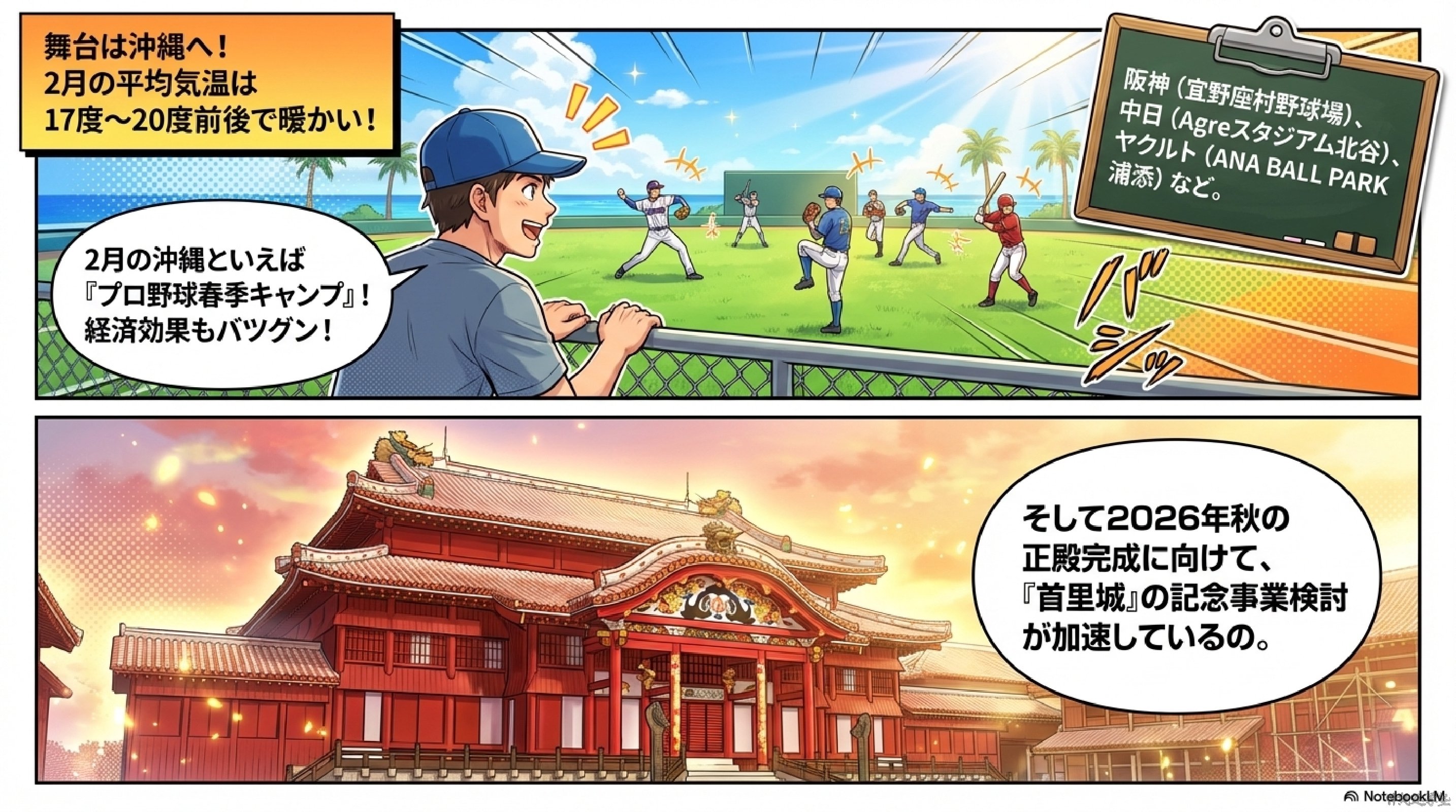 春季キャンプとは、プロ野球のシーズンが始まる前に行う練習合宿のことです。日本のプロ野球では、2月になると多くのチームが沖縄県、宮崎県でキャンプを行います。沖縄は冬でも暖かい、野球場が多いという理由で、毎年多くのチームが訪れます。そのため、観光客も増え、沖縄の経済にも大きな効果があります。