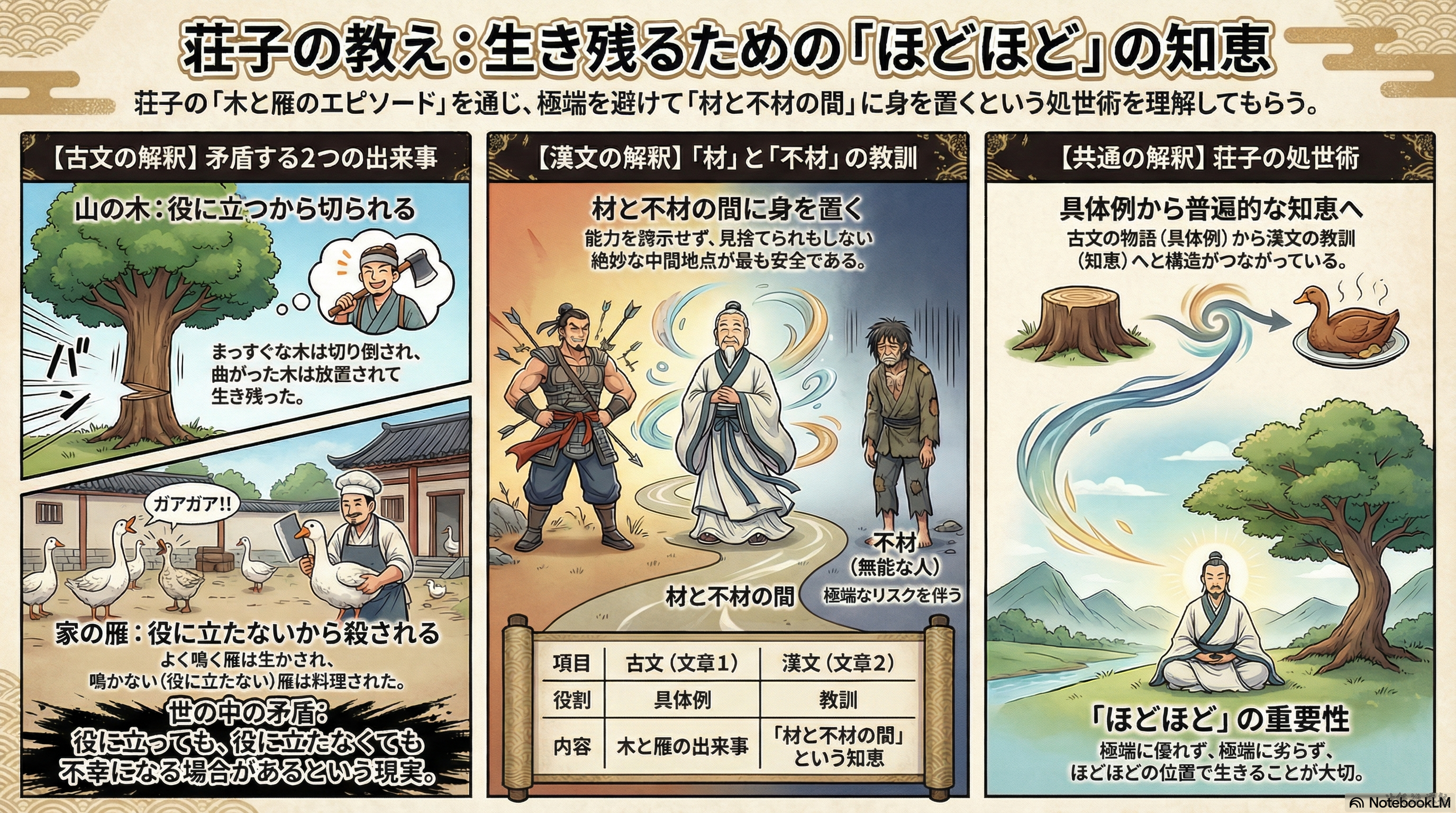 つまり、どちらに偏っても生きにくいということです。そこで文章2では、「材」と「不材」の間に身を置くという荘子の考えが示されます。この内容を最もよく表しているのがイです。