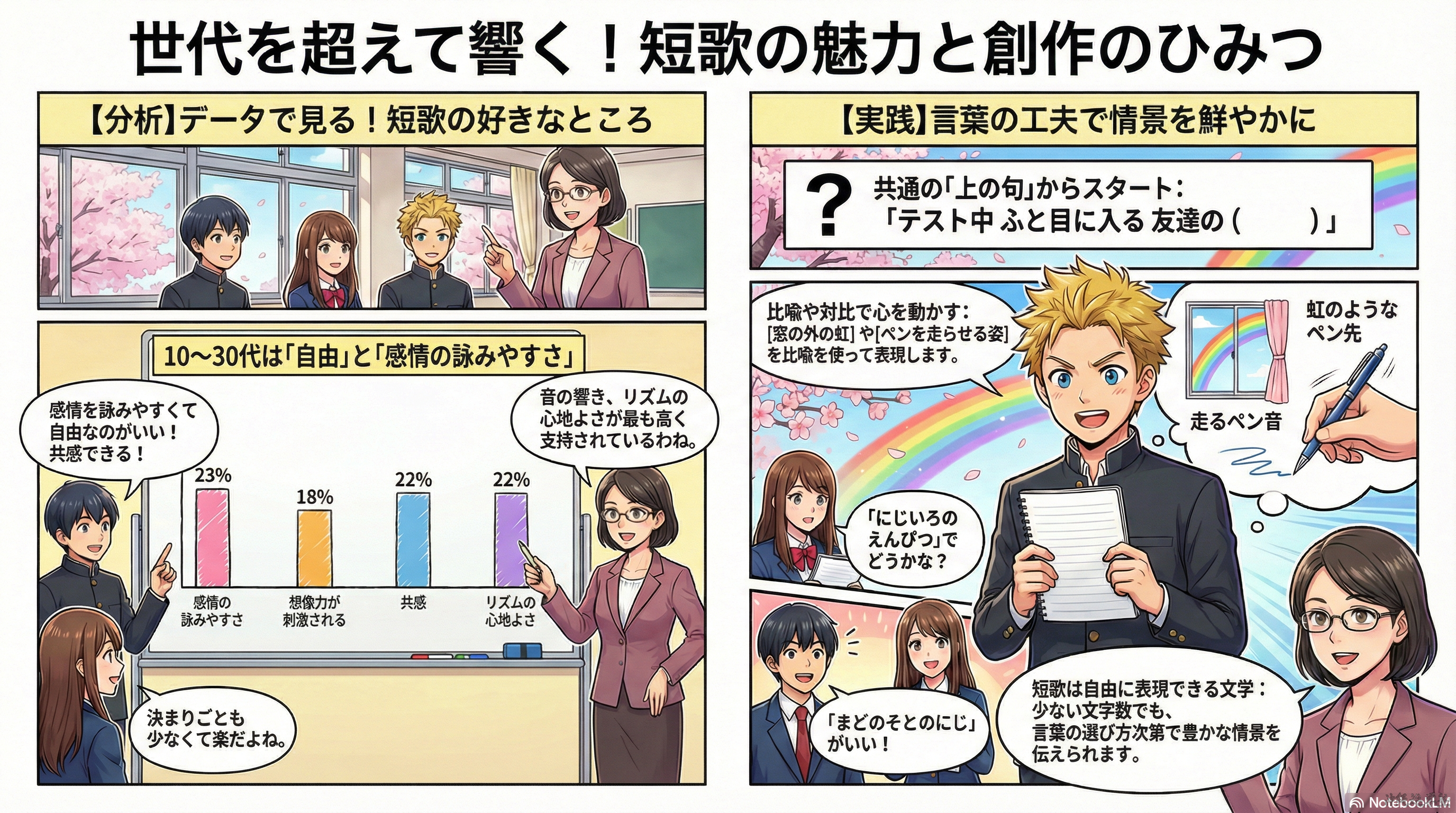 | 本文の中心 | 資料(アンケート)で短歌の魅力を整理し、創作を通して理解を深める |
