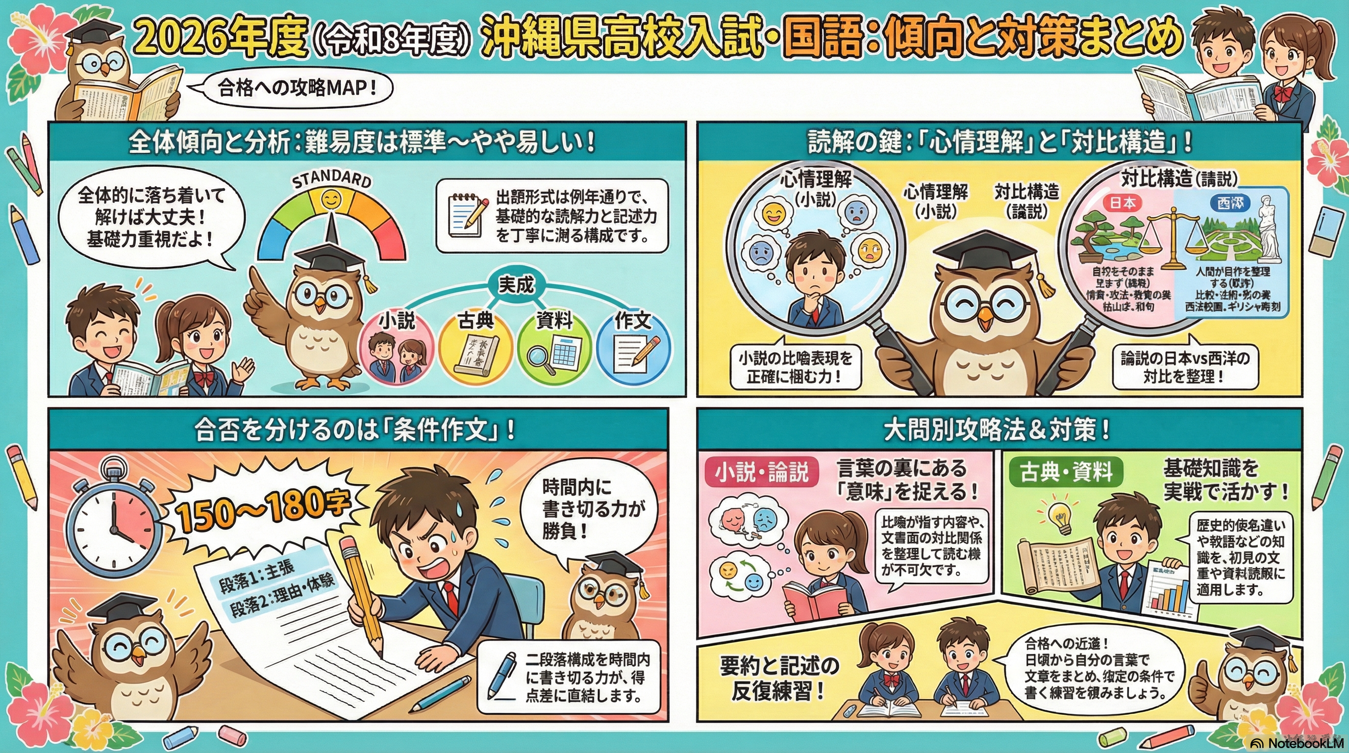 総合的に見ると、2026年度の国語は難易度としては「標準〜やや易しい」レベルです。ただし、作文や記述に慣れていない生徒にとっては時間配分が難しく、そこで差が生まれた可能性があります。沖縄県の国語入試では、単に文章を読むだけでなく、文章構造の整理・比喩理解・自分の言葉で書く力が重要です。普段の学習でも、要約や記述の練習を積み重ねることが合格への近道と言えるでしょう。