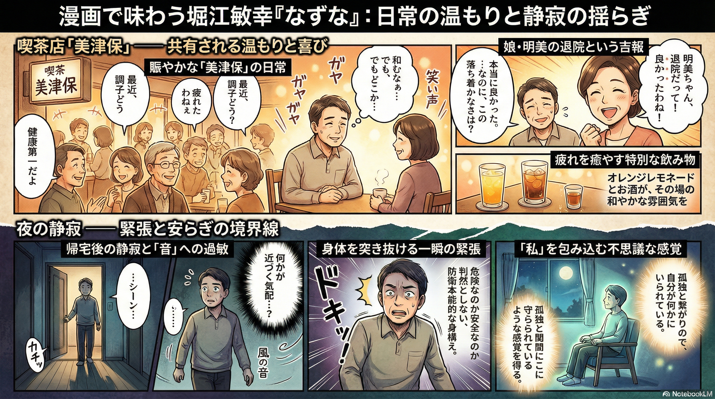 店を出て家に帰ると、静かな夜の空気の中で物音が聞こえ、私はふと不安な気持ちになる。玄関の近くで、何かが近づいてくるような気配を感じると、急に体が緊張し、思わず身構えてしまう。周囲の静けさの中で、私は自分が守られているのか、それとも危険にさらされているのか、はっきりしない感覚を抱く。こうした出来事を通して、「私」は人とのつながりや自分の置かれている状況について考えながら、静かな夜の中で不思議な感覚に包まれていく。