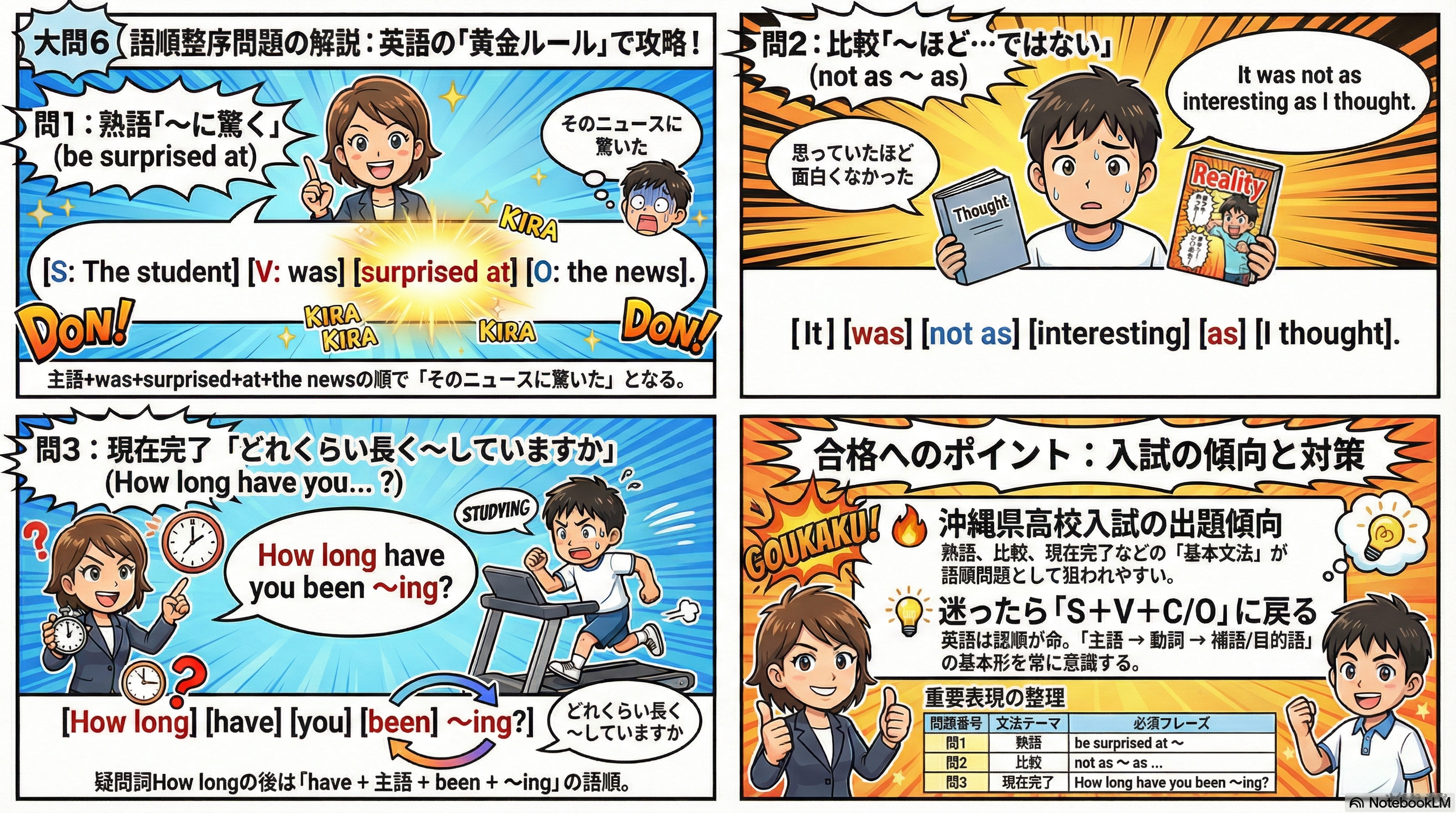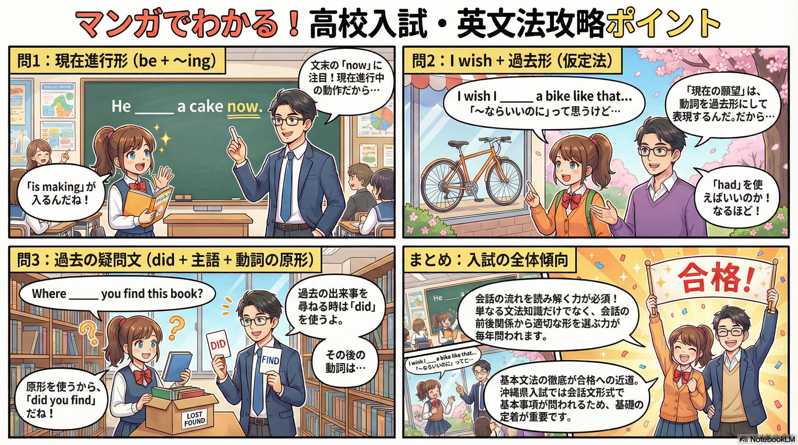 沖縄県高校入試では、文法問題だけでなく、このような「会話理解」の問題も毎年出題されています。英語を読むときは前後の意味のつながりを意識して考えることが大切です。