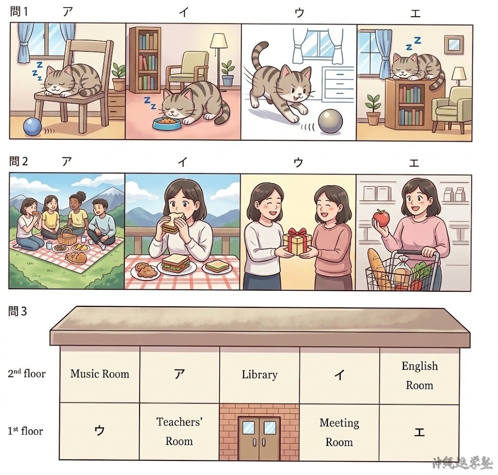 大問1は、英文と質問を聞き、その内容に最も合う絵を選ぶ問題です。英文と質問はそれぞれ1回だけ読まれます。ポイントは「動作・場所・時間」のキーワードを素早く拾うことです。